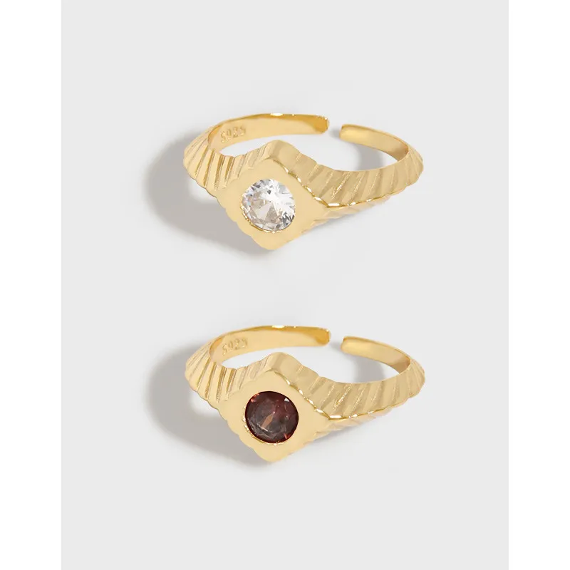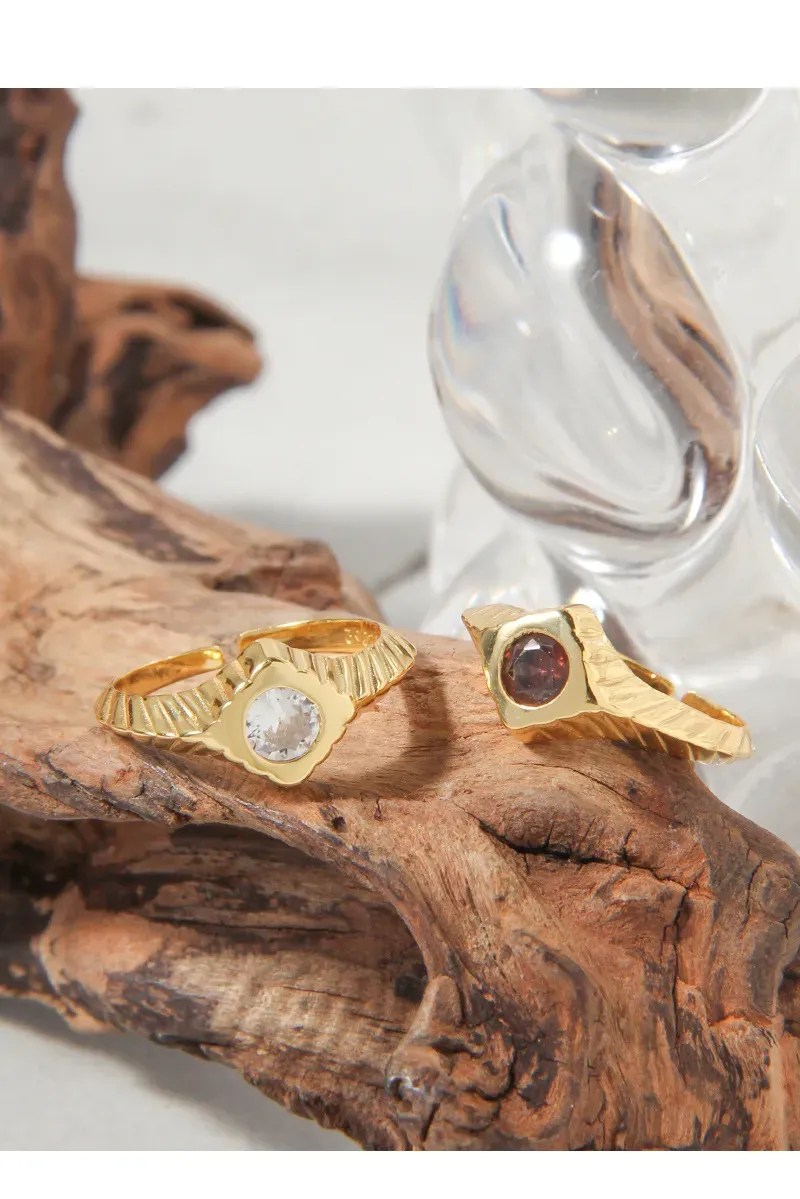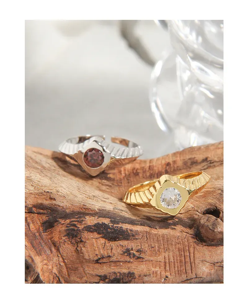 • Color: Crafted in gleaming gold, this adjustable Vynestra Ring features a prominent round gemstone available in two captivating hues: a brilliant clear stone reminiscent of the night sky’s shimmer, or a deep, rich red that evokes the profound depth of earth’s hidden treasures.
