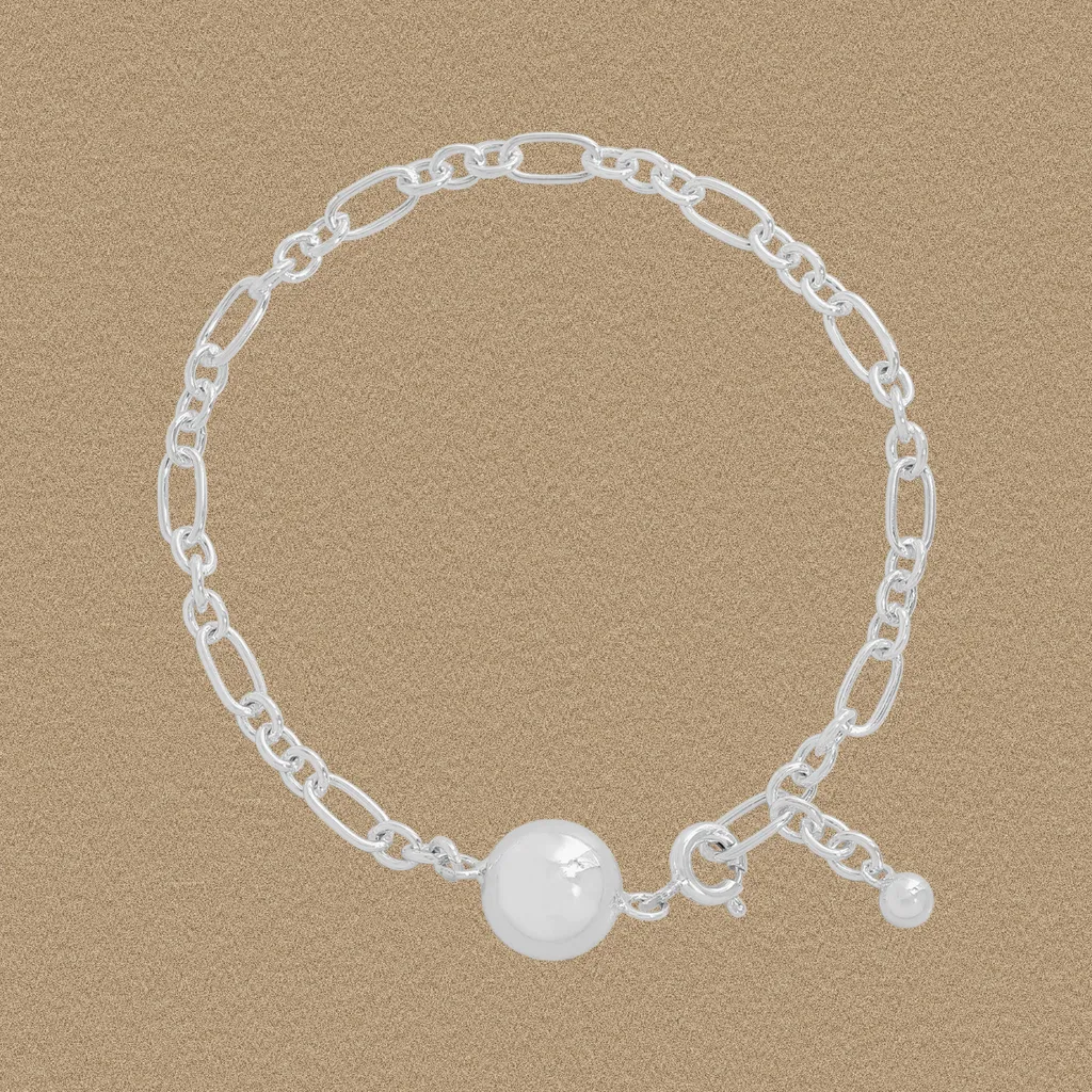 This elegant bracelet showcases a brilliant silver-tone finish, radiating a polished glow. Its contemporary design features a distinctive chain composed of alternating elongated oval and smaller round links, creating a visually fluid pattern. A prominent, lustrous white sphere, reminiscent of a pristine pearl, serves as the captivating centerpiece. The smooth, reflective surfaces of both the metallic chain and the central sphere offer a refined and luxurious texture.