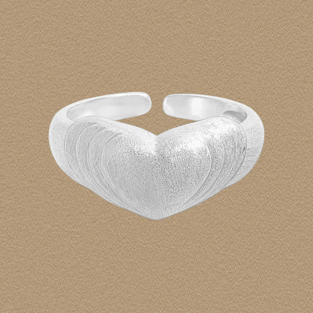 • Patterns & Textures: The prominent heart motif showcases a unique frosted or brushed texture, creating a soft, matte finish that subtly catches the light. This tactile surface is complemented by delicate, undulating ripples on the sides, reminiscent of natural elements and adding to its organic charm. The inner band is smoothly polished for comfort.