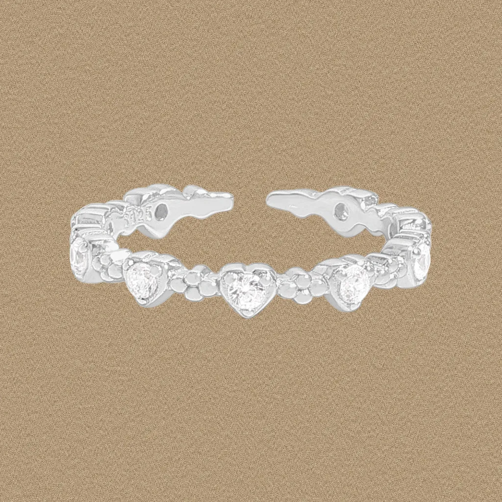 - Patterns & Textures: The ring showcases a captivating sequence of three prominent heart-shaped clear stones, each meticulously prong-set. These hearts are interspersed with arrays of small, rounded bead-like elements, creating a tactile, organic texture. The band further dazzles with smaller, rectangular clear stones, enhancing its continuous sparkle and reflecting the imperfect beauty of nature’s patterns.