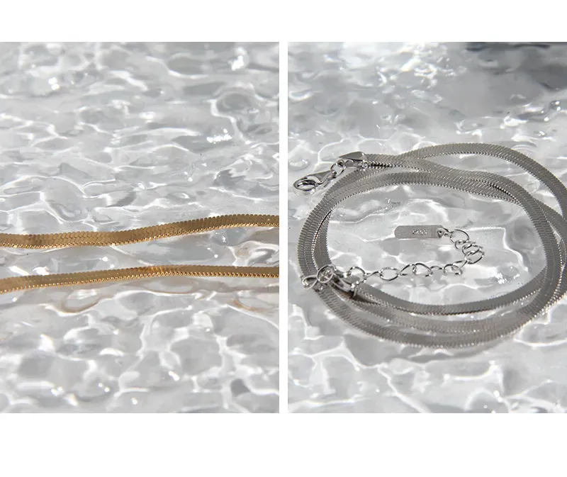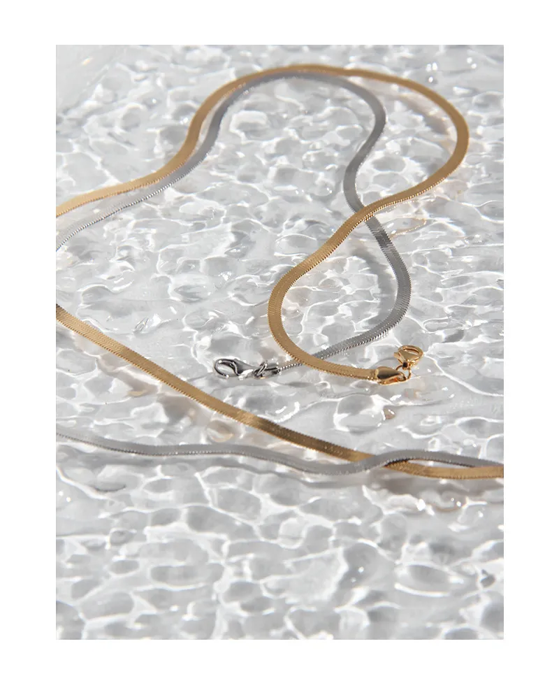 - Patterns & Textures: The prominent wider chain boasts a remarkably smooth, flat surface, reflecting light with a luxurious, seamless sheen, evoking the organic flow found in nature. Complementing this, the finer, second chain features a subtle, finely textured edge, adding a touch of intricate detail that speaks to the imperfect beauty of natural patterns.
