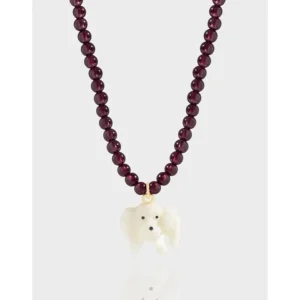 Embrace the enchanting spirit of nature with this exquisite Malisse necklace, featuring a lustrous mother-of-pearl dog charm suspended from a strand of deep garnet beads. Inspired by the organic beauty and celestial hues of the cosmos, this piece captures a delicate balance between whimsical charm and natural elegance.