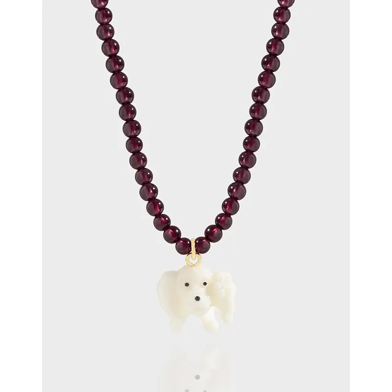 - Patterns or Textures: Each spherical garnet bead boasts a smooth, highly polished surface, reflecting light with a deep, mesmerizing luster. The intricately carved mother-of-pearl dog charm features a smooth, luminous texture that catches the light, highlighting its delicate contours and the subtle, natural patterns inherent to the shell.
