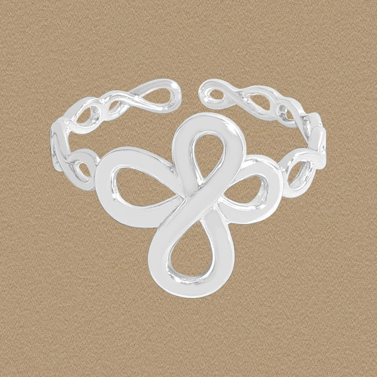 • Patterns & Textures: The surface is flawlessly smooth and highly polished, enhancing the graceful, continuous curves of the design. The band itself showcases smaller, interconnected infinity-like loops, culminating in a larger, intertwined knot at its core, creating a fluid and organic aesthetic that mirrors nature’s own captivating patterns.
