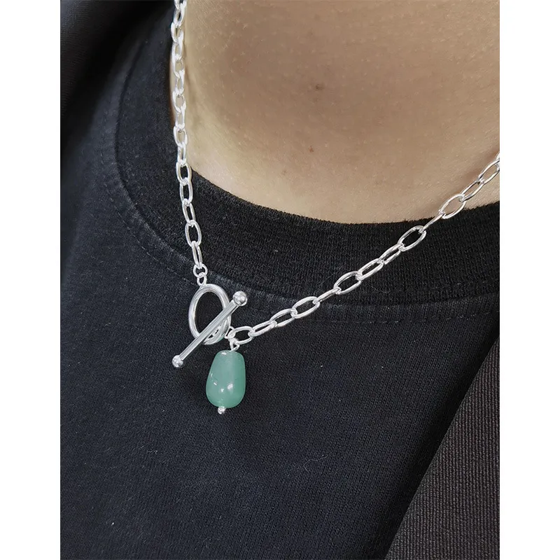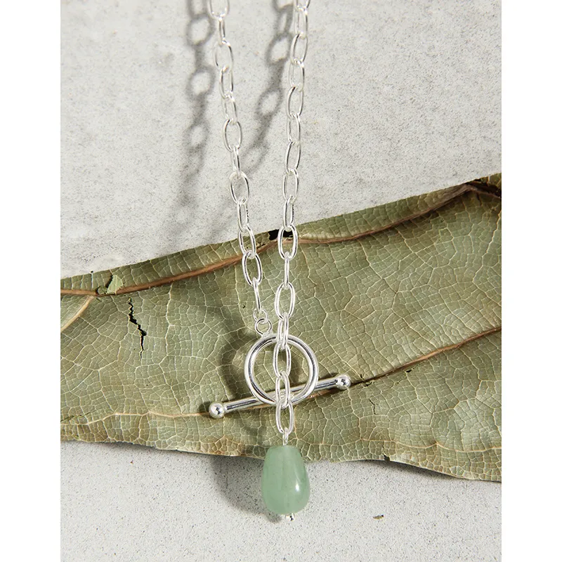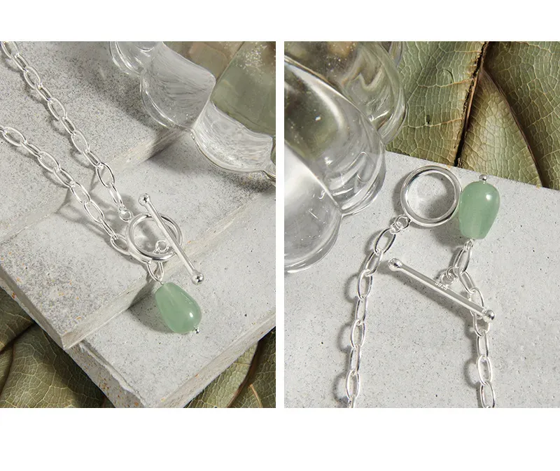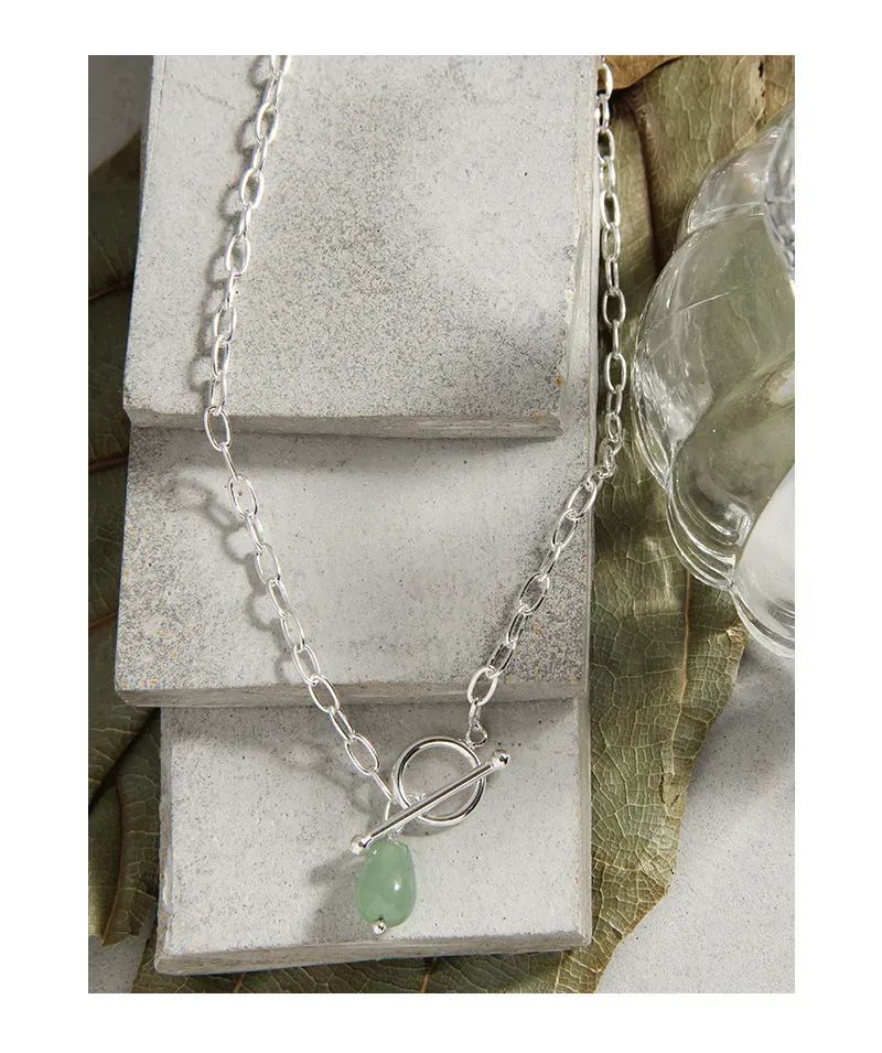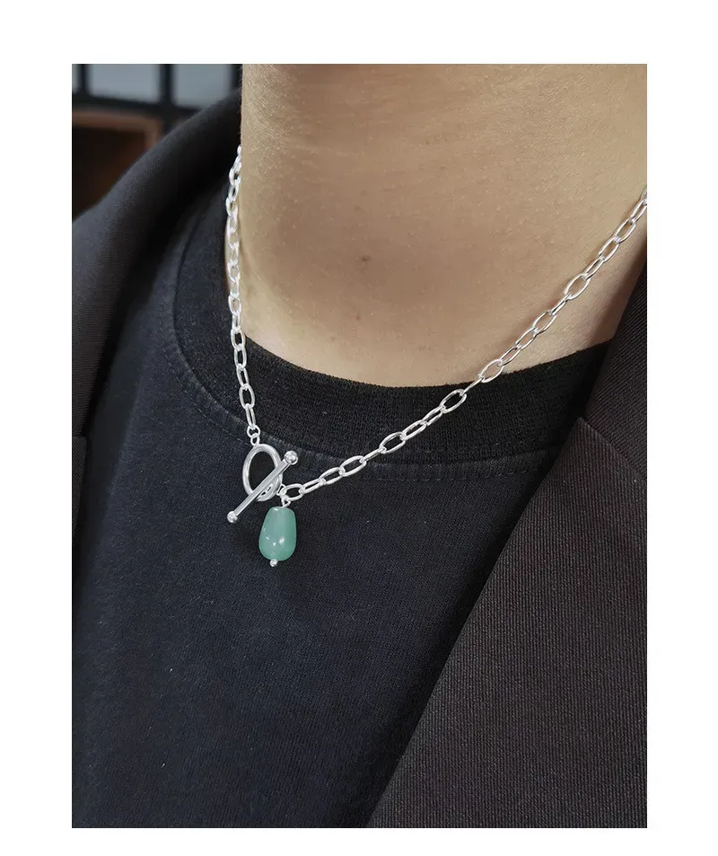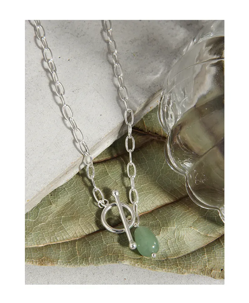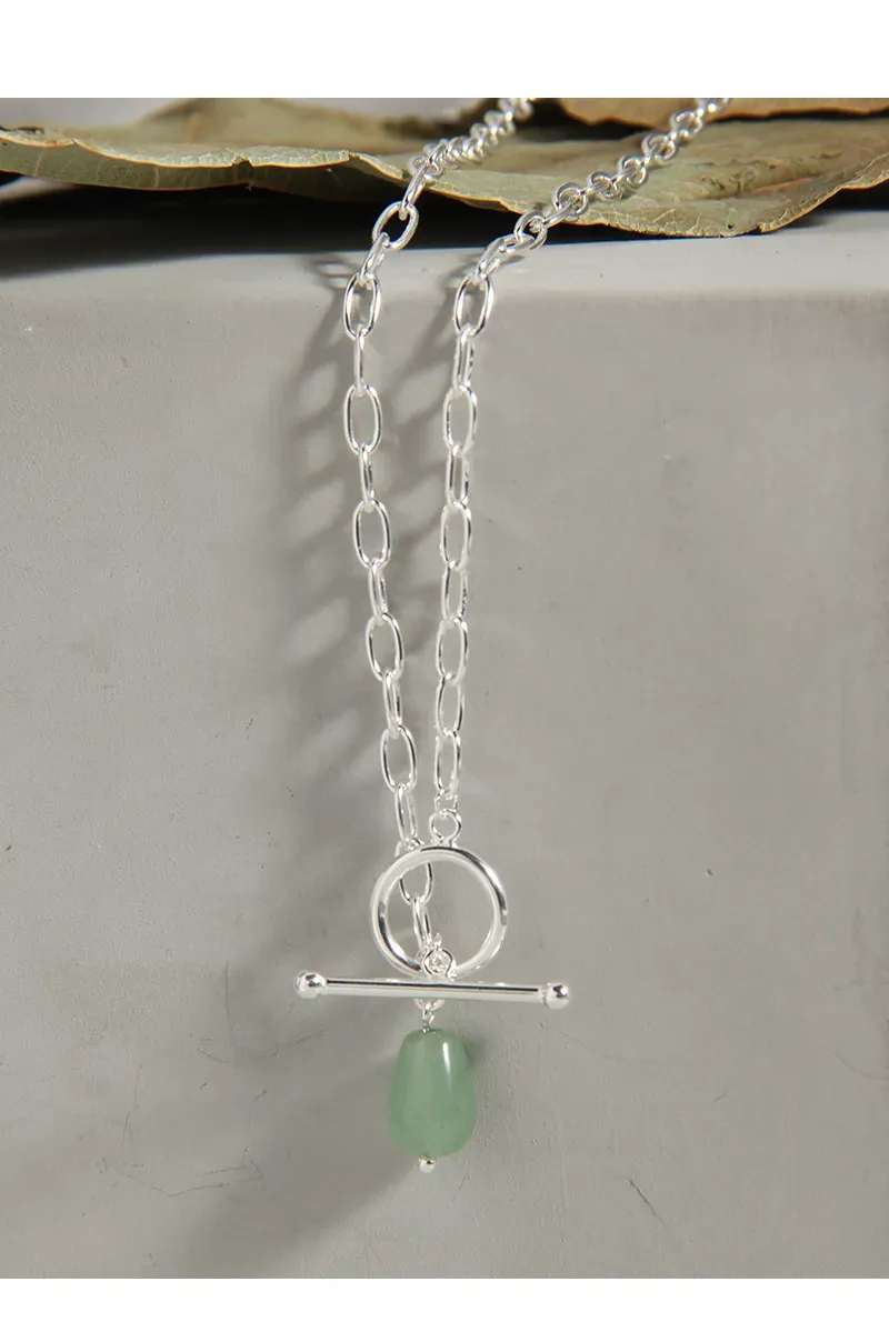 • Style & Design: A focal point of this necklace is its modern toggle clasp, elegantly designed with a polished silver-toned ring and a complementary T-bar closure. This unique element not only secures the necklace but also functions as an integral design feature, from which the verdant gemstone gracefully dangles. The overall style is minimalist yet impactful, blending raw textures and fluid shapes.