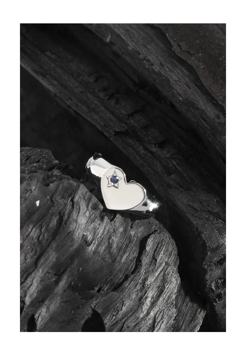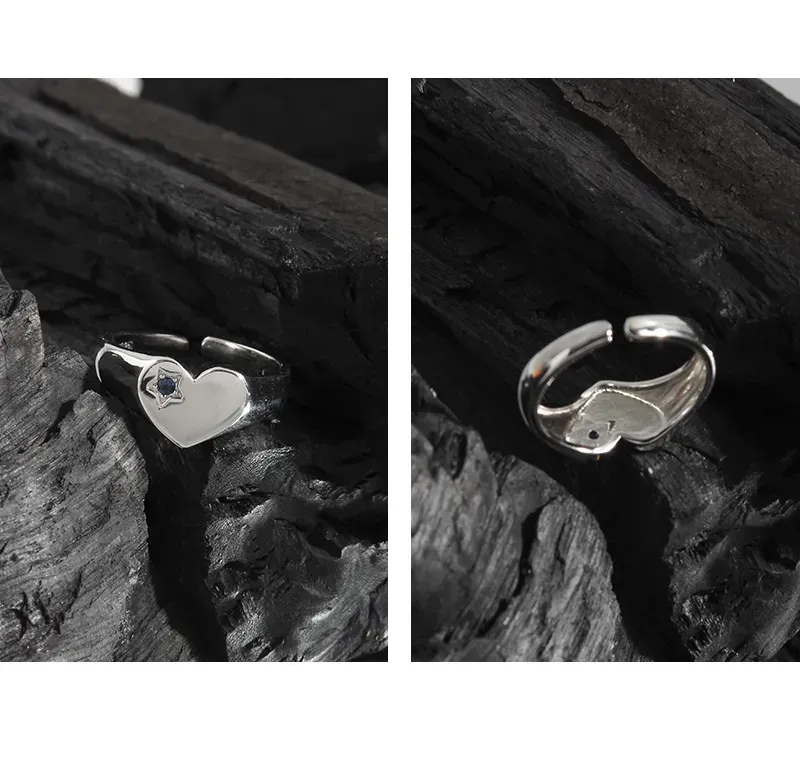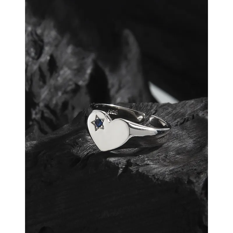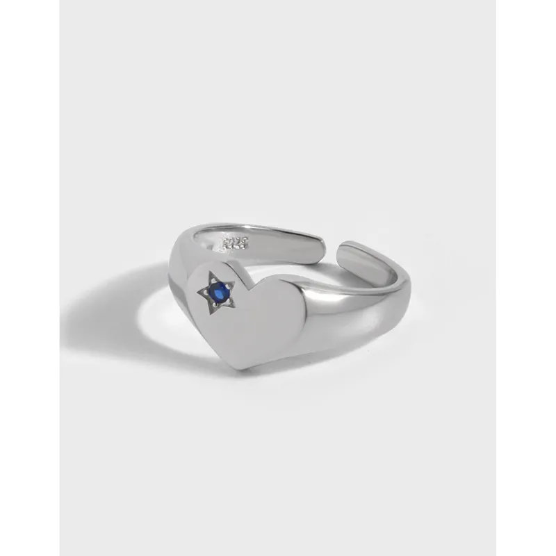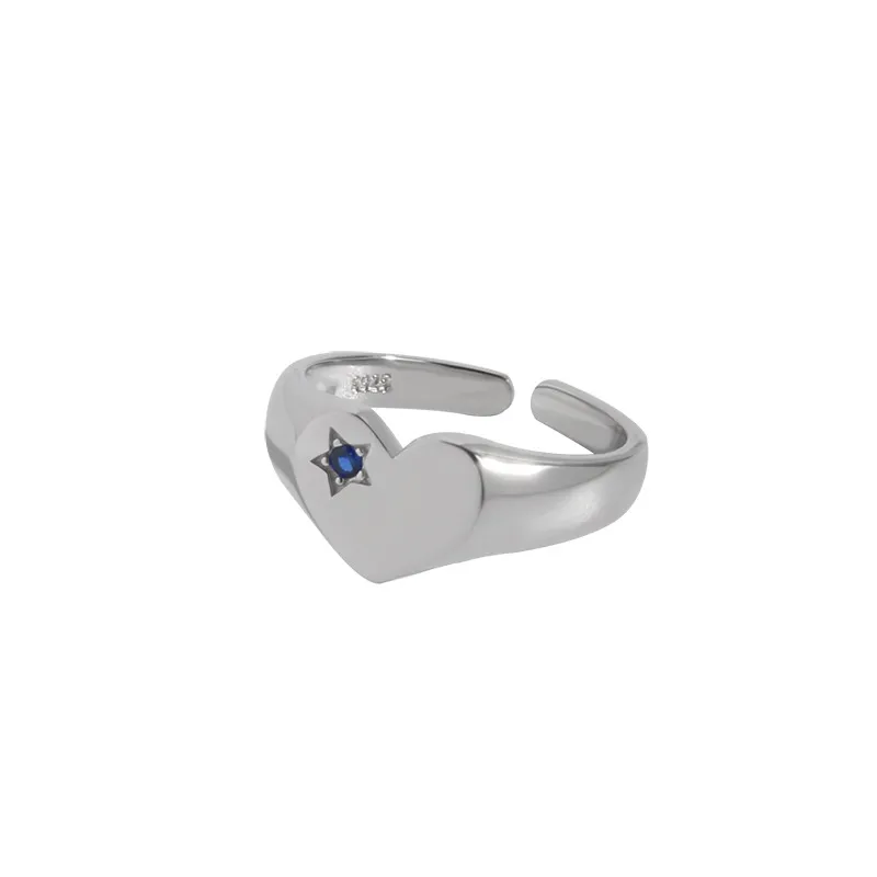 • Patterns & Textures: The ring boasts a smooth, highly polished finish throughout. The heart motif is adorned with a precisely cut star shape, housing a brilliant round blue gemstone. The inner band is discreetly engraved with “S925,” affirming its quality.