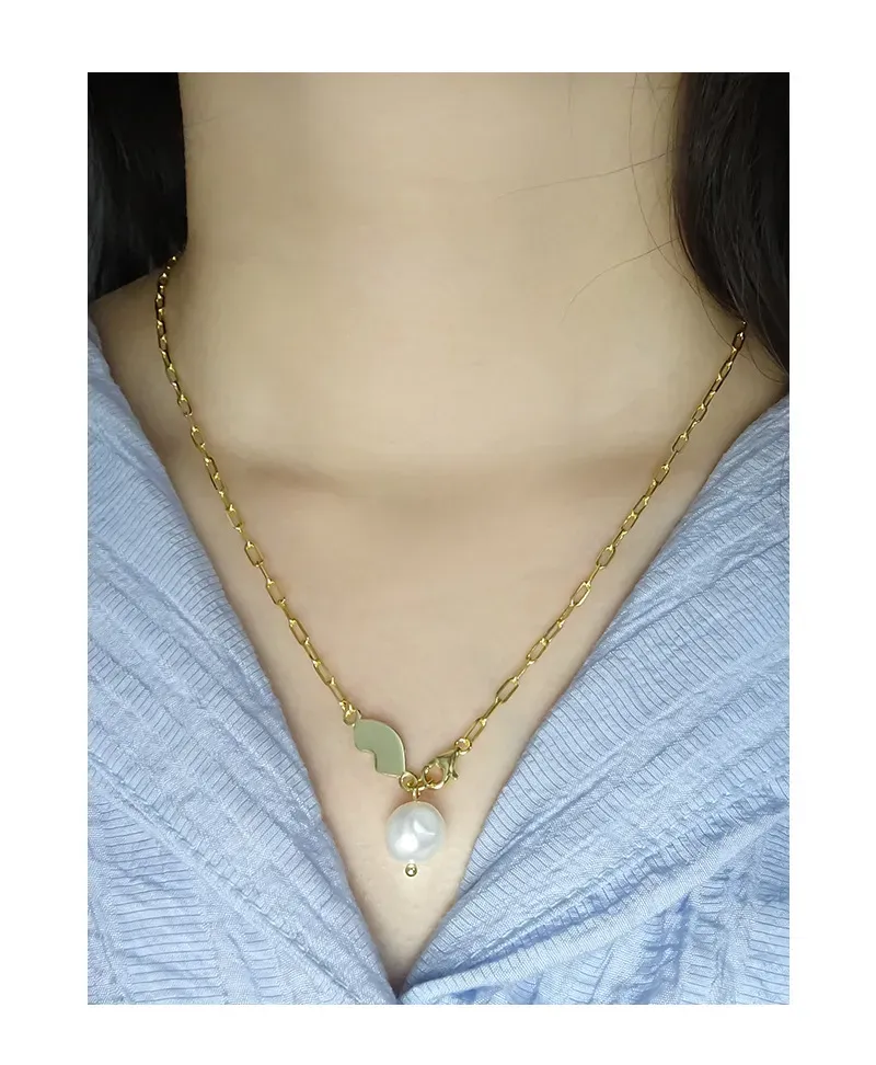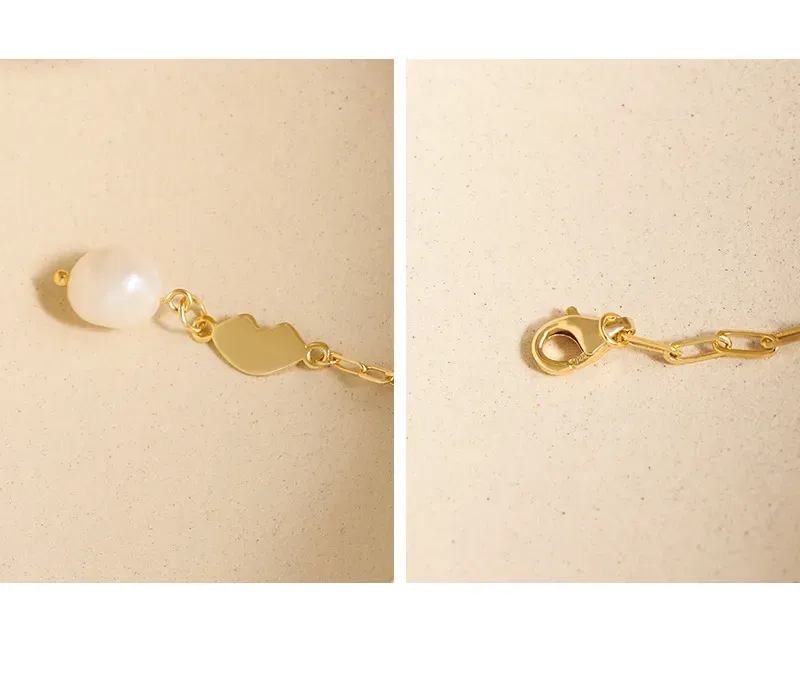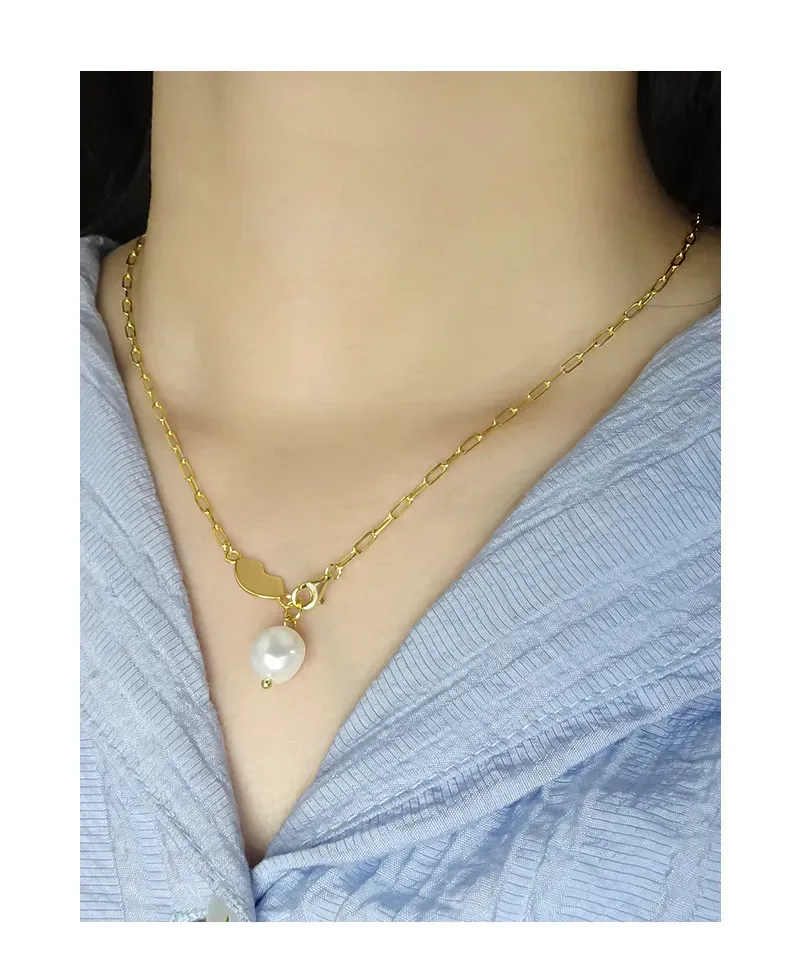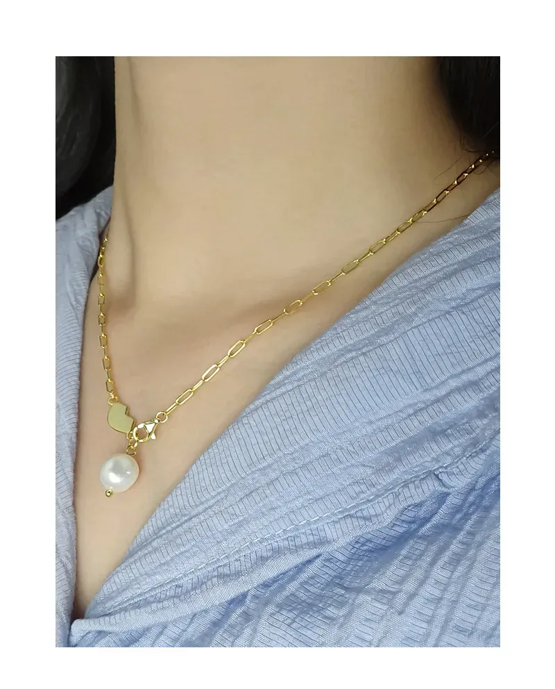 - Patterns & Textures: The elongated links of the chain feature a smooth, polished texture, reflecting light with every movement. The organic gold element boasts a similarly sleek, reflective surface, while the baroque pearl exhibits its natural, subtly irregular, and luminous texture, celebrating the imperfect beauty of nature’s artistry.