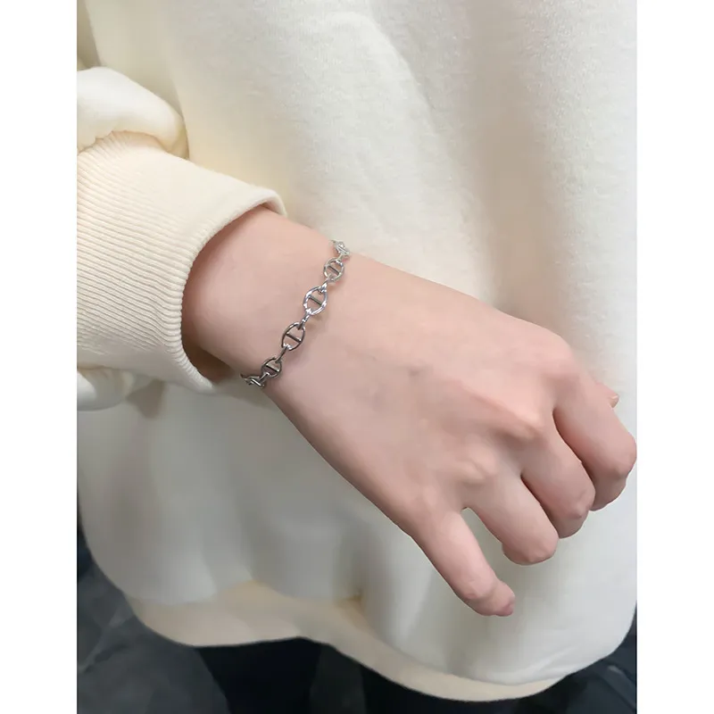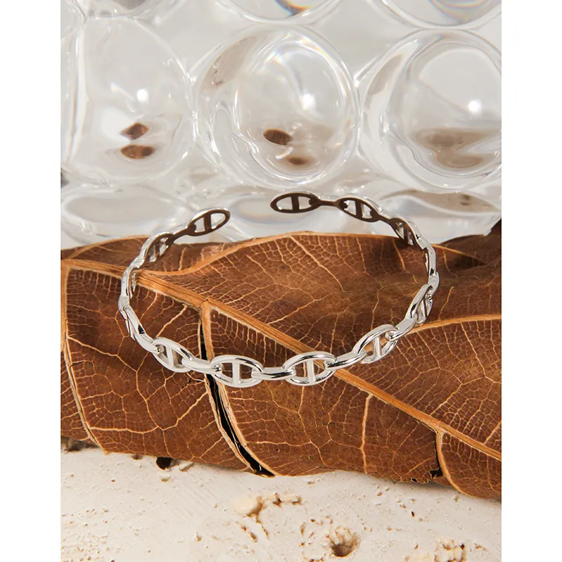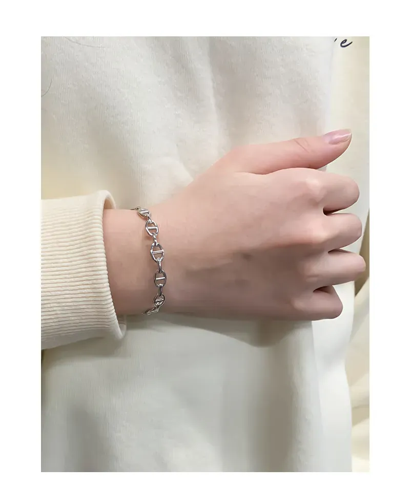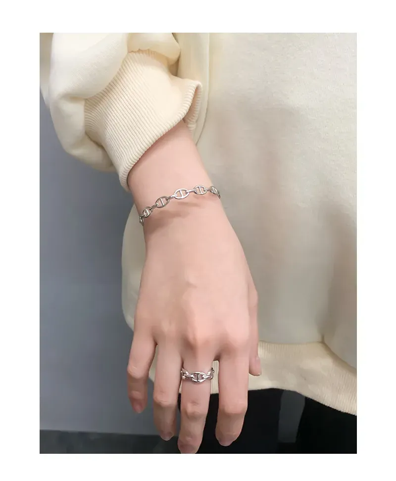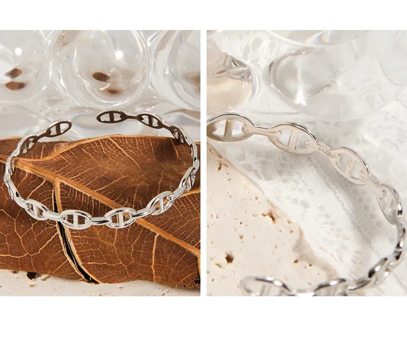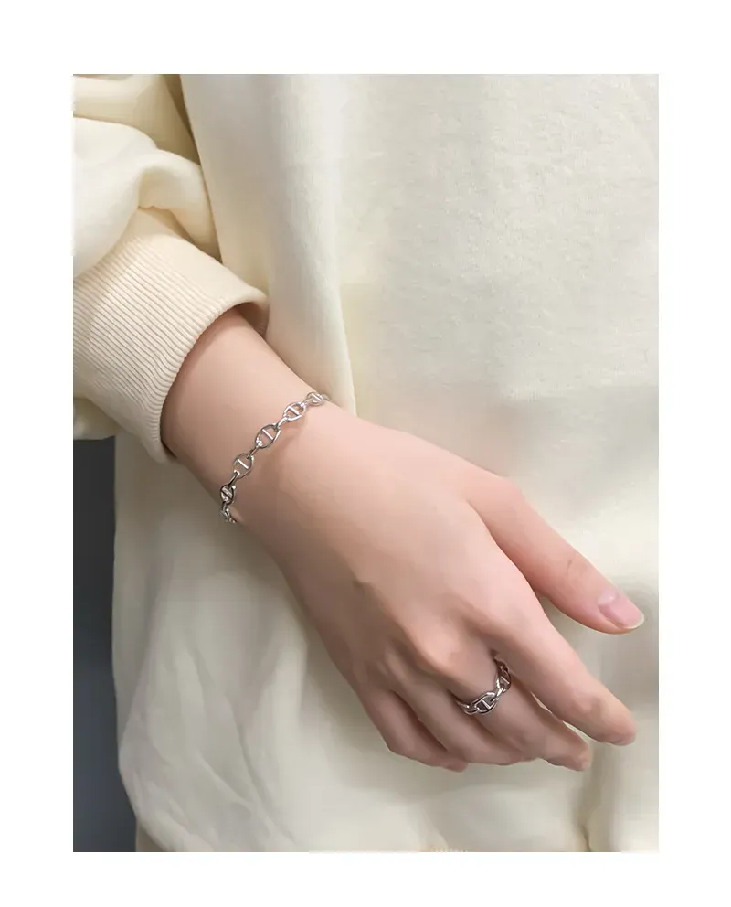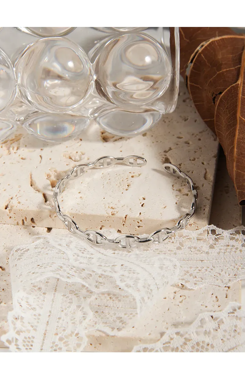 The Xelythra Bracelet’s continuous pattern features finely crafted anchor chain links. Each link, with its distinctive bar, creates a delicate yet pronounced texture, forming a cohesive and flowing design. This intricate detail celebrates the imperfect beauty of nature’s patterns and the timeless allure of its artistry.