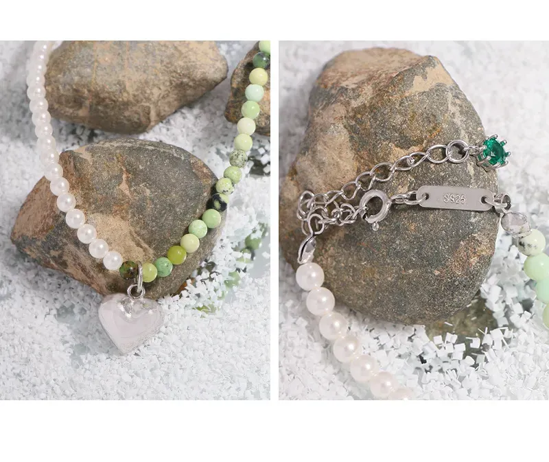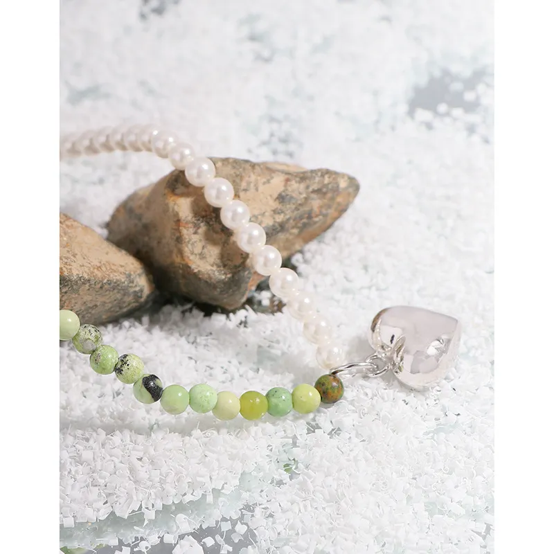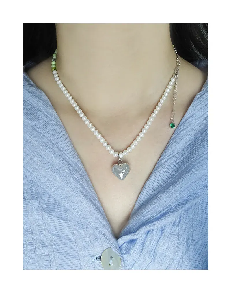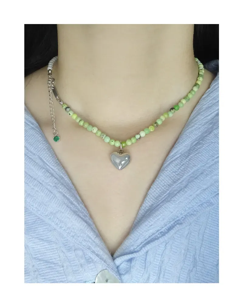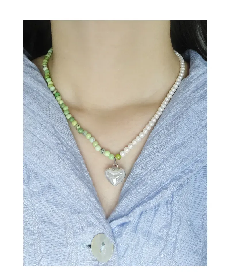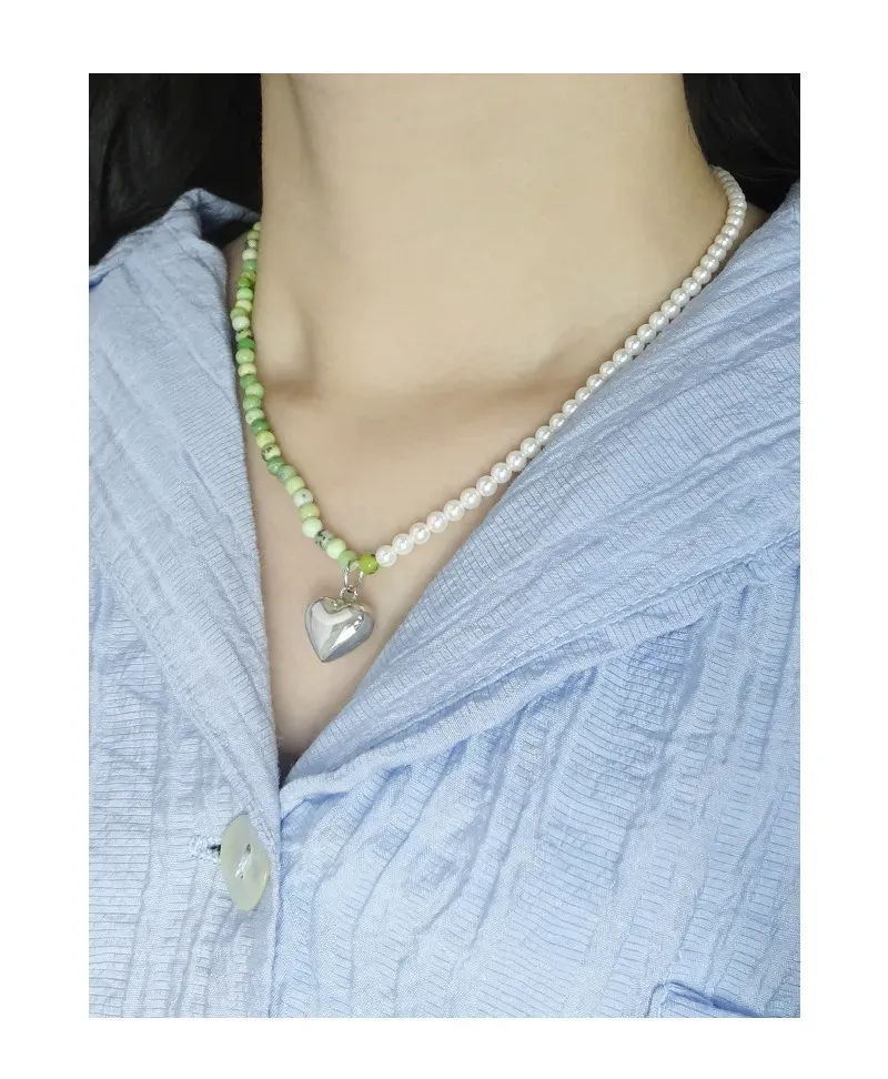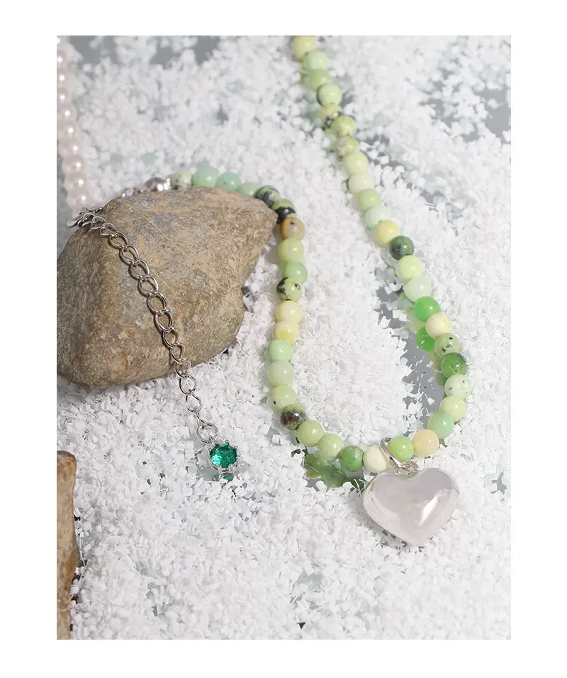 Patterns or Textures: Experience the captivating diversity of natural textures. The green beads display an array of patterns, from smooth, polished surfaces to intricate mottled and speckled formations, highlighting their authentic geological character. These rich, raw textures are beautifully juxtaposed with the uniform, creamy smoothness and radiant luster of the spherical pearls. The transparent, glass-like heart pendant adds a final touch of ethereal clarity and reflection.