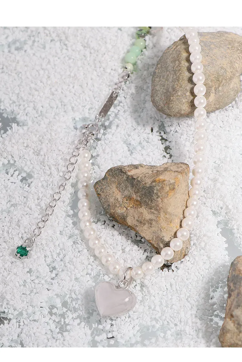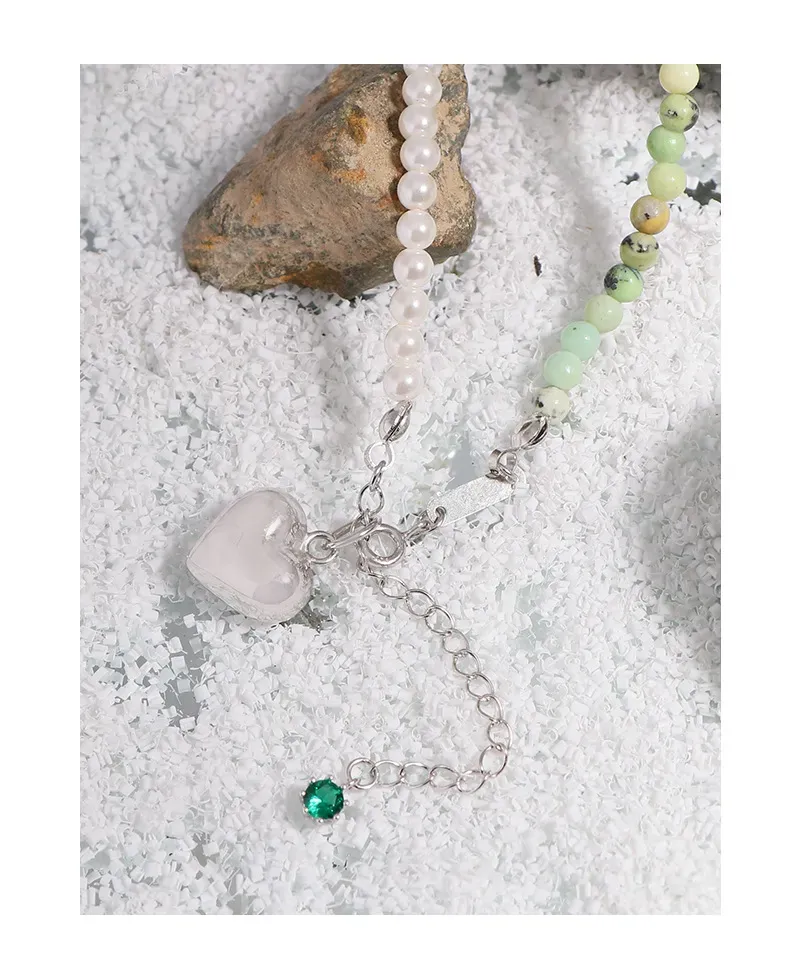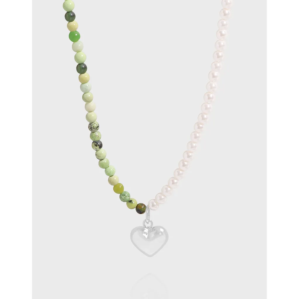 Color: One half of the Ximina Necklace features an enchanting spectrum of natural green beads, transitioning from bright lime and olive to deeper, mottled green variations. This vibrant display harmoniously meets the other half, composed of classic, lustrous white pearls. A clear, silvery heart pendant hangs gracefully at the center, completing the captivating palette.