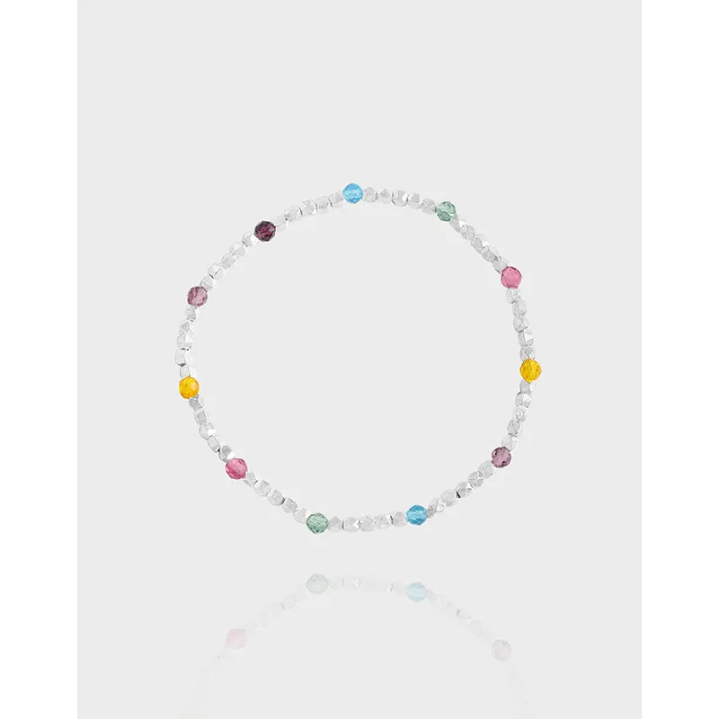 • Patterns & Textures: The Xithara Bracelet features an captivating rhythm of irregularly shaped, faceted silver beads that evoke raw, natural textures and the imperfect beauty of organic forms. Interspersed amongst these are luminous, round, faceted colorful beads that catch and refract light, mimicking the shimmering dance of starlight and the depth of gemstones.