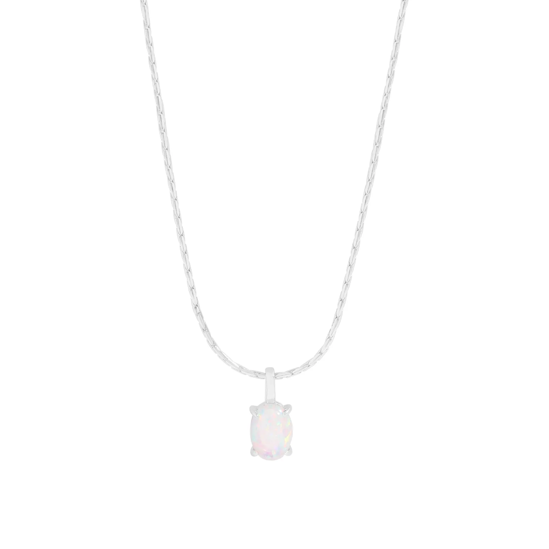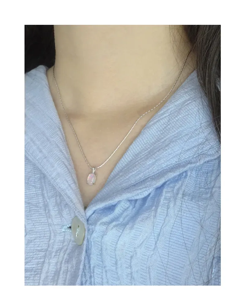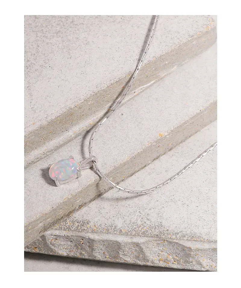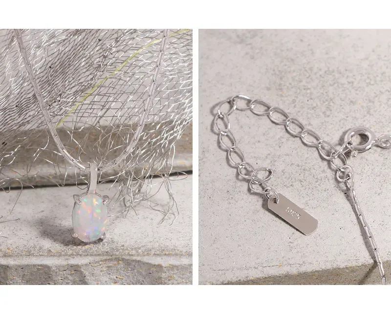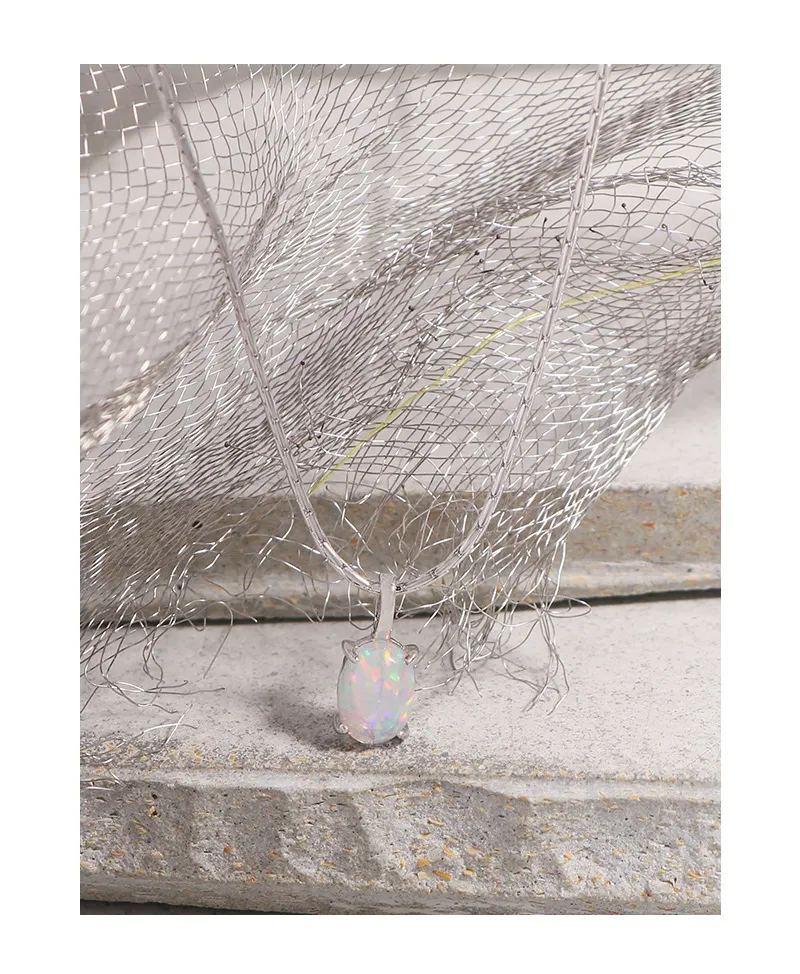 • Color: The necklace features a brilliant silver-tone chain and a secure four-prong setting, beautifully accentuating the main oval-cut opal. The gemstone itself presents an ethereal, iridescent white hue with delicate flashes of pink, blue, and yellow, embodying the celestial colors Malisse celebrates.