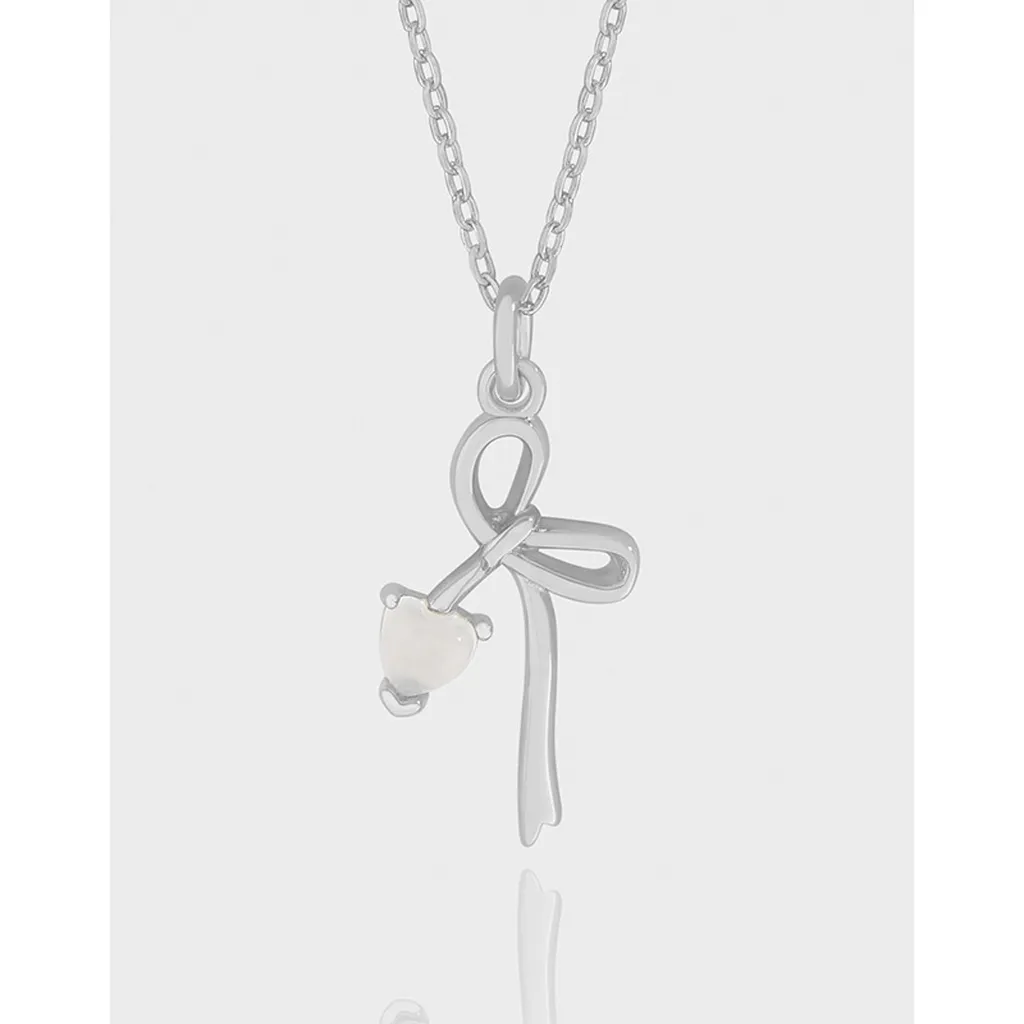 Elegant Silver Bow Necklace with Pearlescent Heart