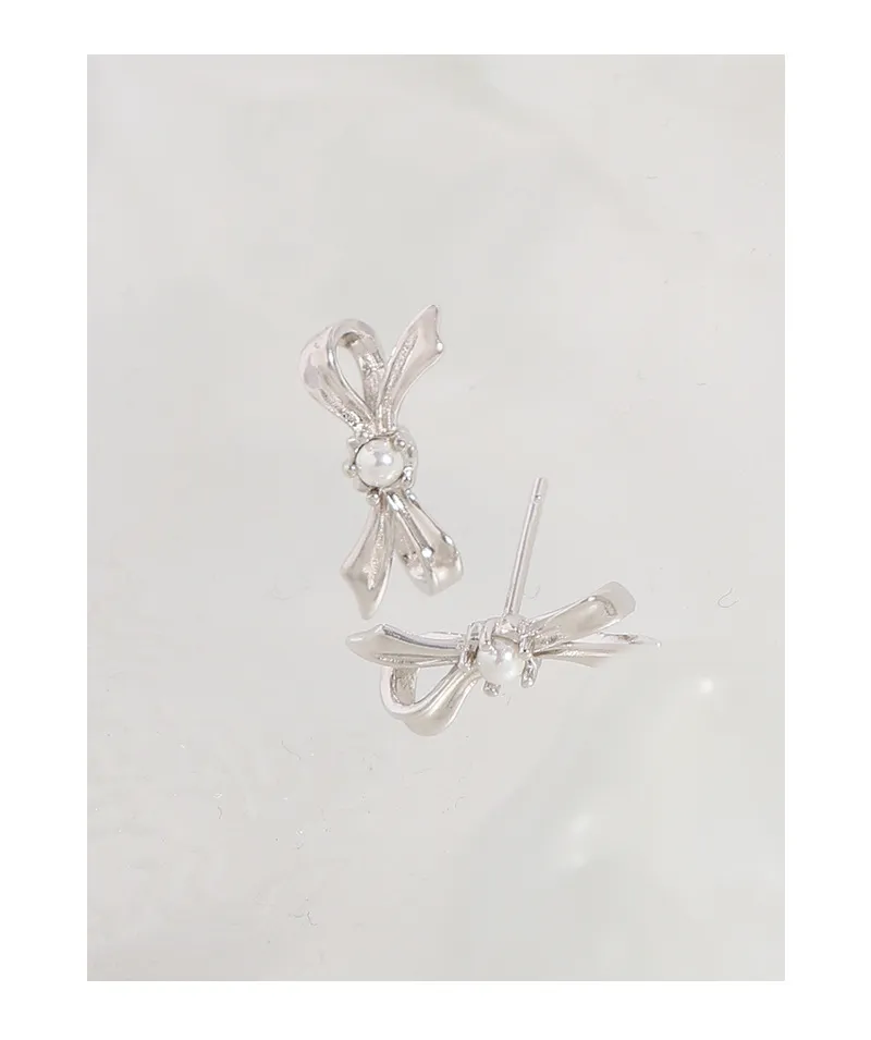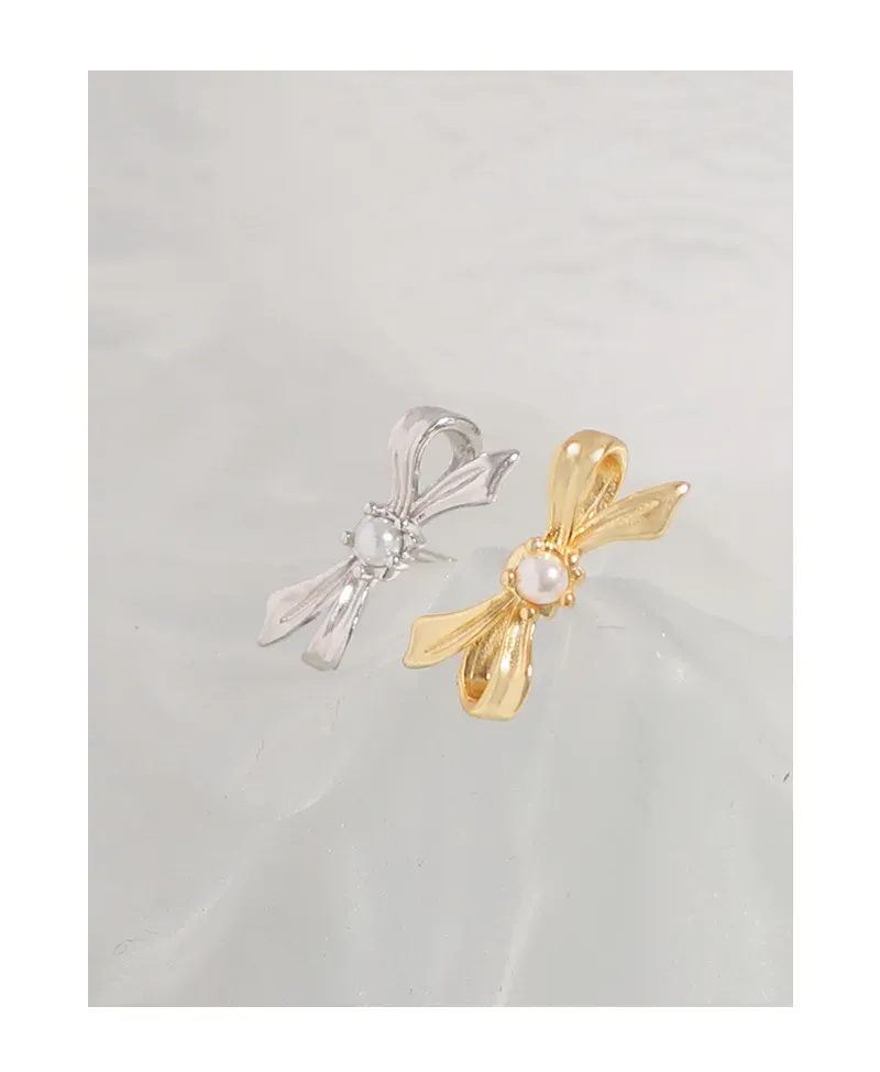 - Patterns or Textures: Crafted with a smooth, polished finish, the golden metal catches the light beautifully, highlighting the intricate ribbon-like folds of the bow design. This creates a subtle interplay of light and shadow, giving the piece depth and an organic flow. The central pearl offers a soft, iridescent texture, perfectly complementing the metallic sheen.