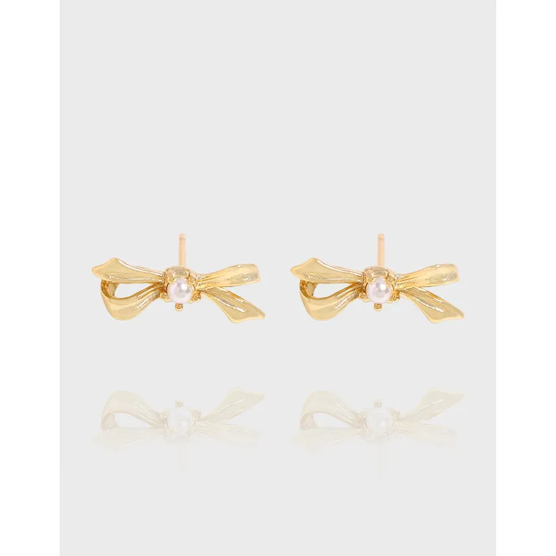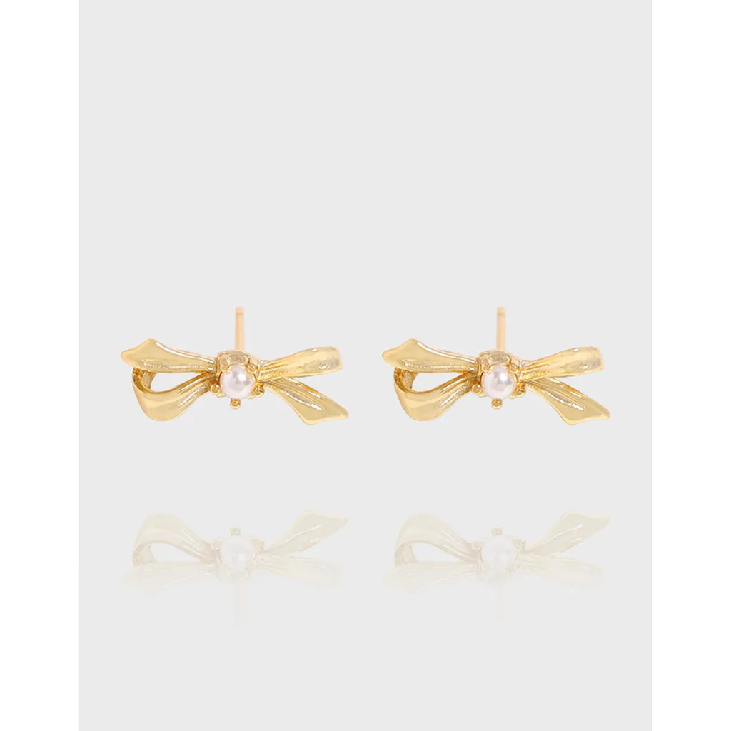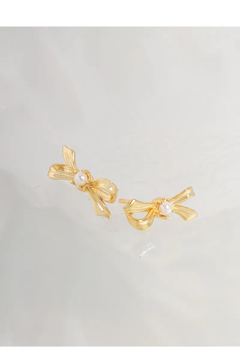 Elegant Gold Bow Stud Earrings with Pearl Detail