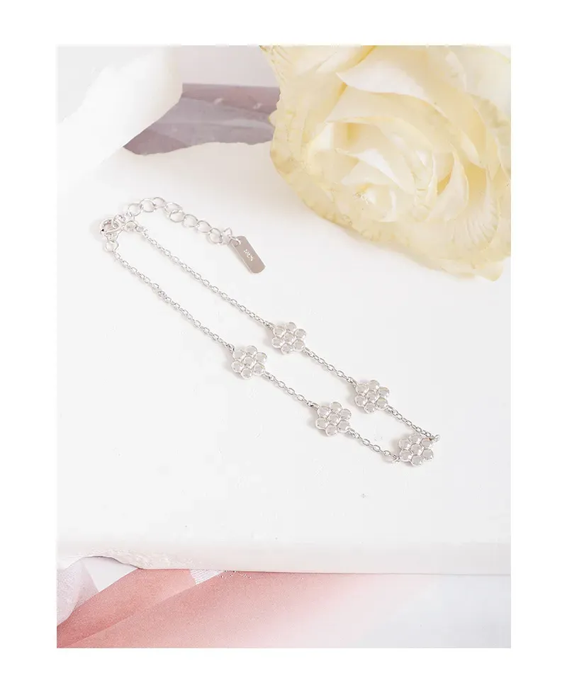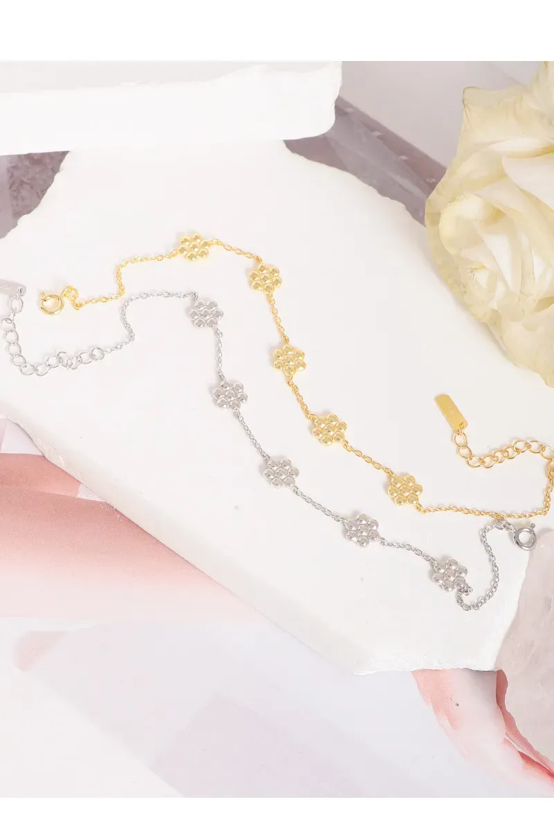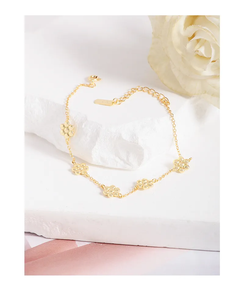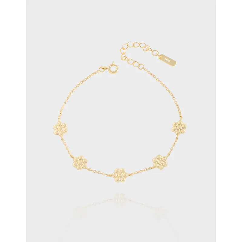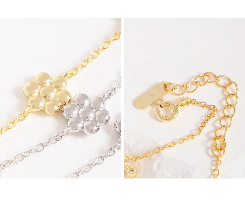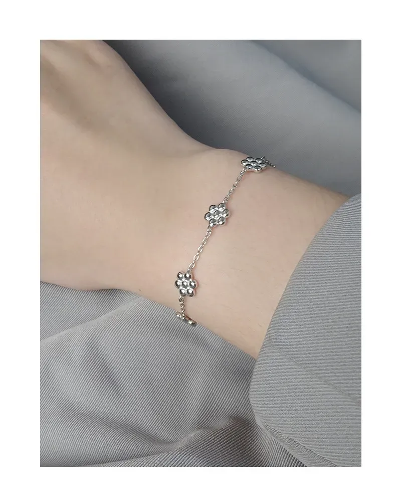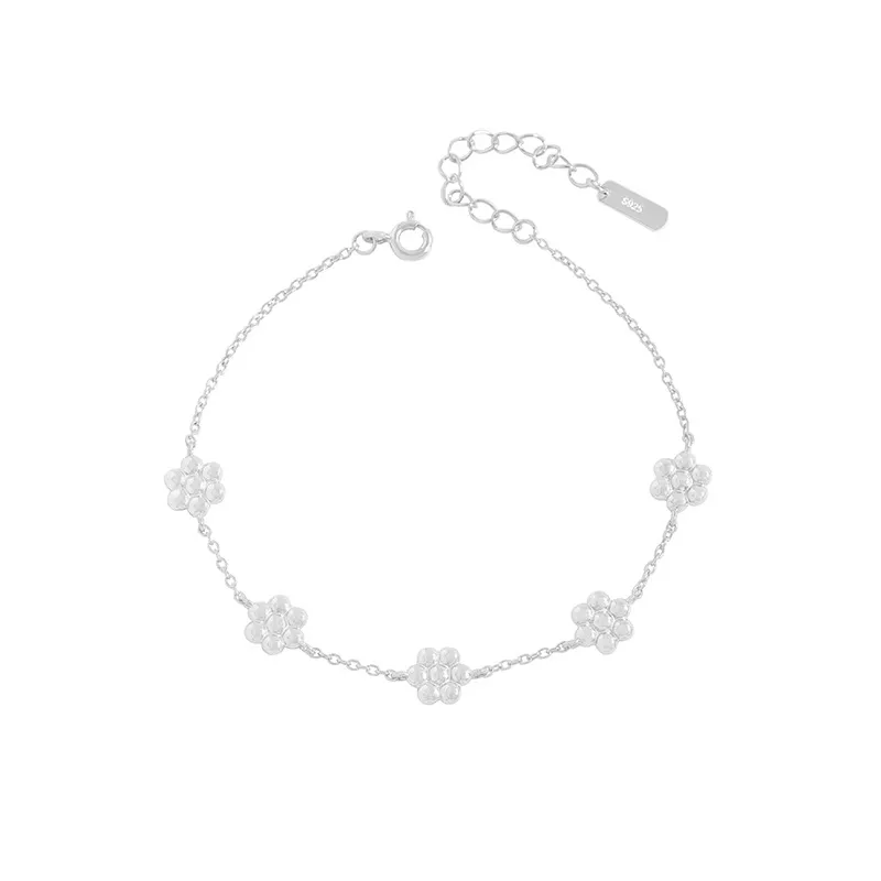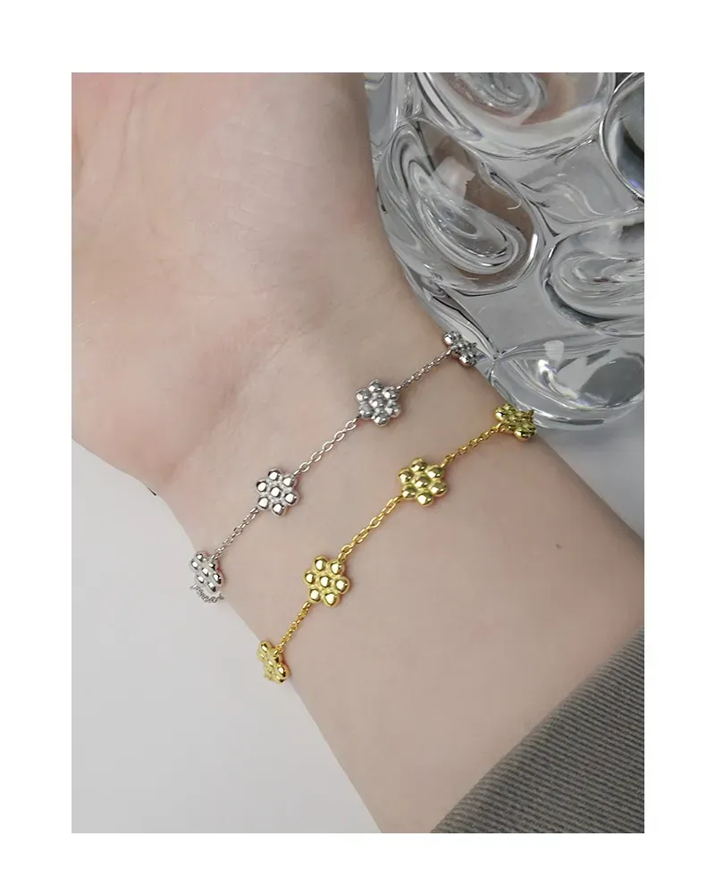- Patterns & Textures: Five exquisitely crafted flower charms are spaced along the delicate chain, each boasting a uniquely textured surface. This intricate detailing gives the appearance of tiny, clustered spheres forming each petal, creating a tactile and reflective finish that beautifully catches and shimmers with light, mirroring the imperfect beauty of nature’s patterns.