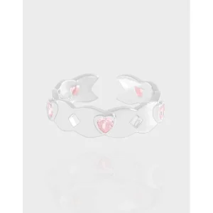 • Color: A smooth white enamel-like finish gracefully forms the wavy band, providing a serene backdrop for the vibrant pink heart-shaped gemstones. The accents shimmer with clear, crystalline hues.