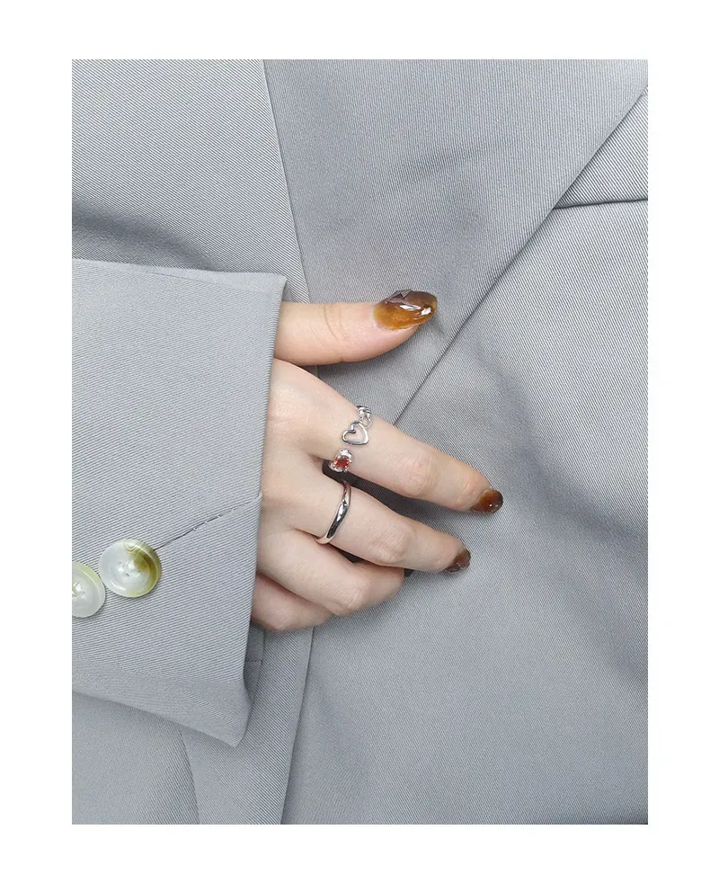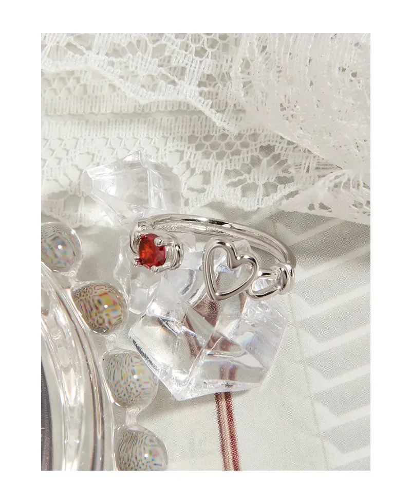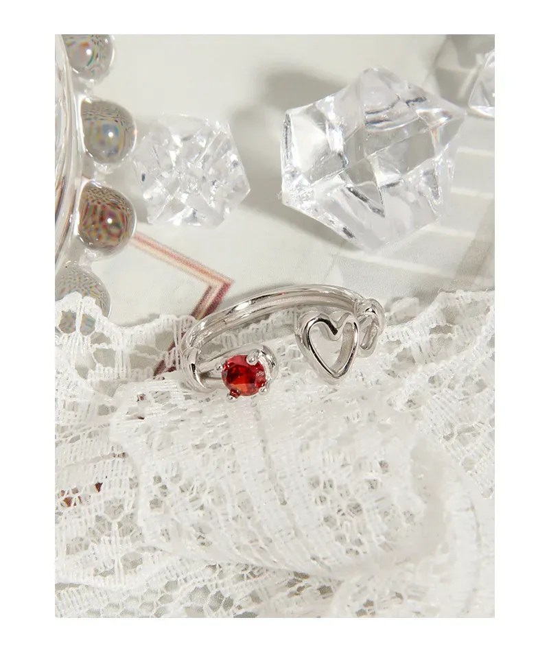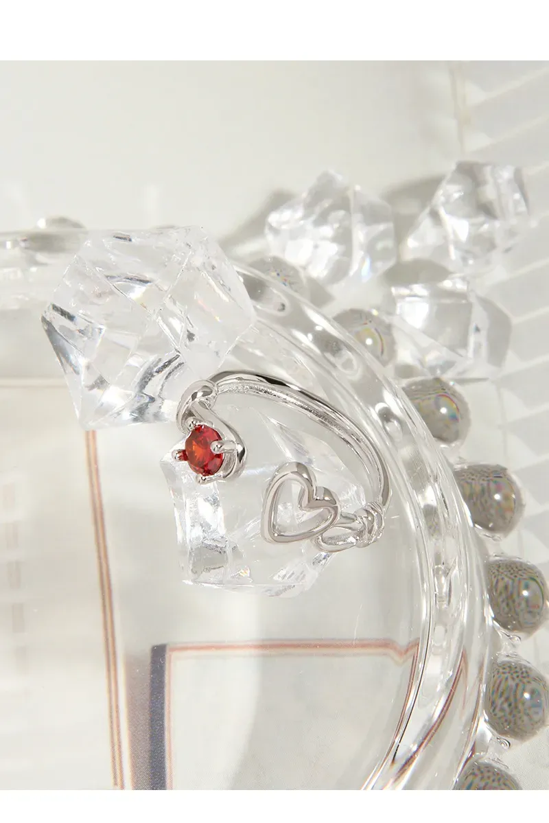• Patterns or Textures: The silver metal boasts a smooth, reflective surface, creating a sleek texture that contrasts beautifully with the precisely faceted red gemstone, allowing it to sparkle with captivating brilliance. The heart motifs are rendered with clean, polished outlines, contributing to the ring’s delicate balance of refined shapes and natural allure.