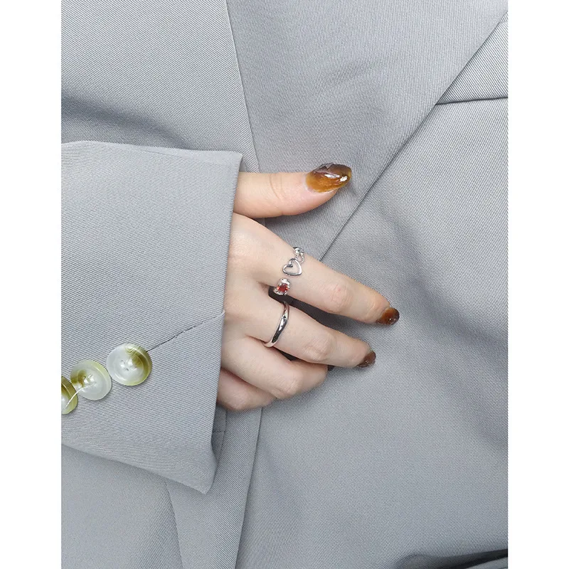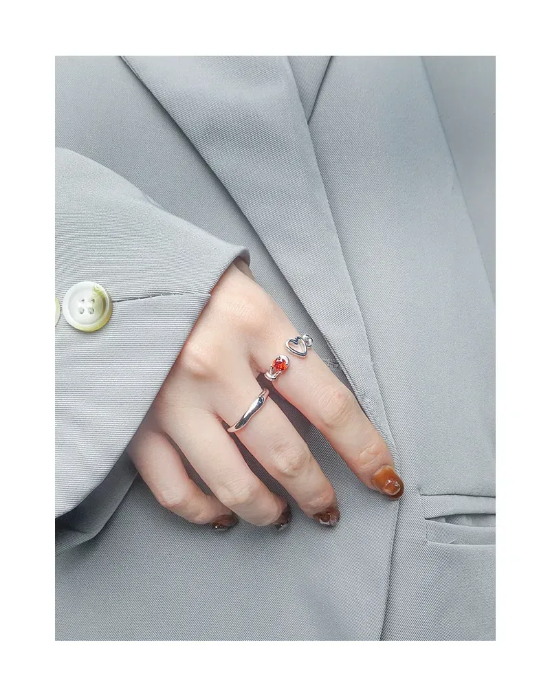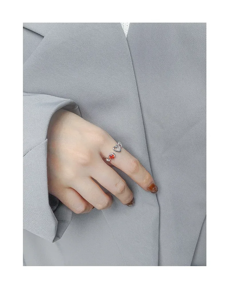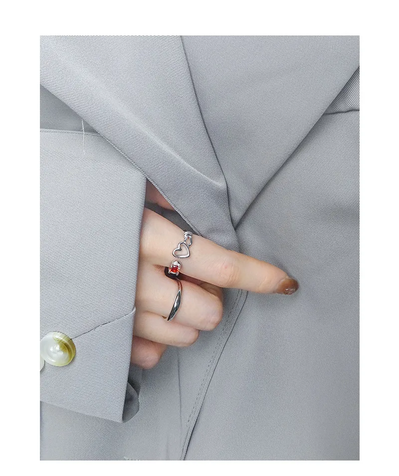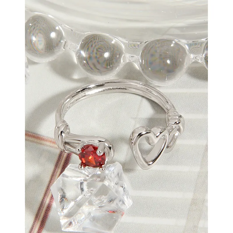 • Patterns or Textures: The silver metal boasts a smooth, reflective surface, creating a sleek texture that contrasts beautifully with the precisely faceted red gemstone, allowing it to sparkle with captivating brilliance. The heart motifs are rendered with clean, polished outlines, contributing to the ring’s delicate balance of refined shapes and natural allure.