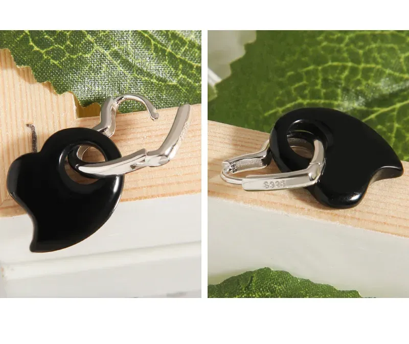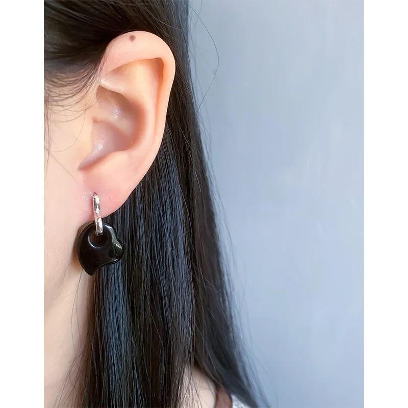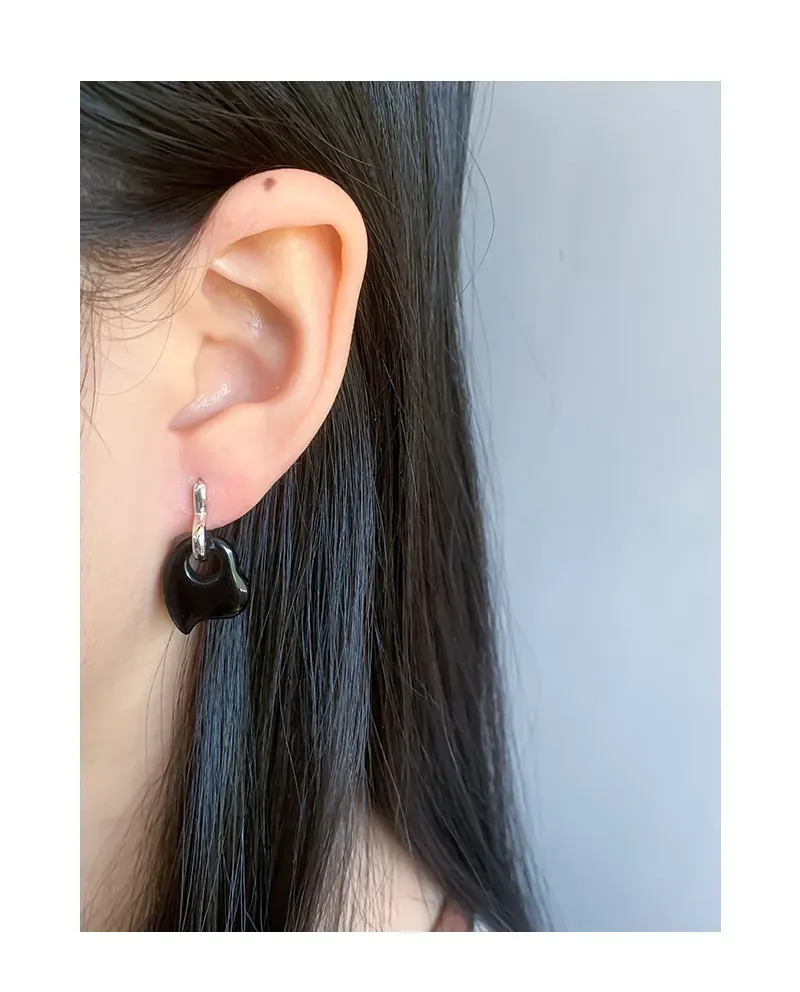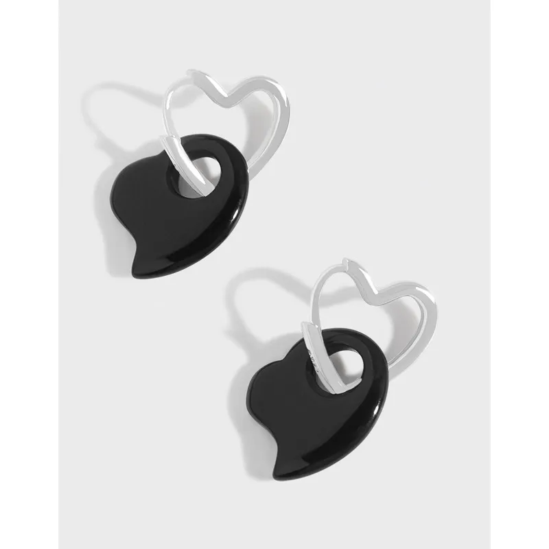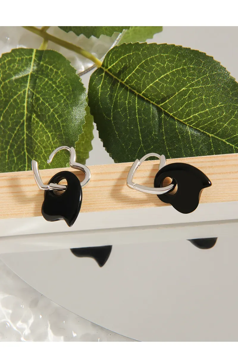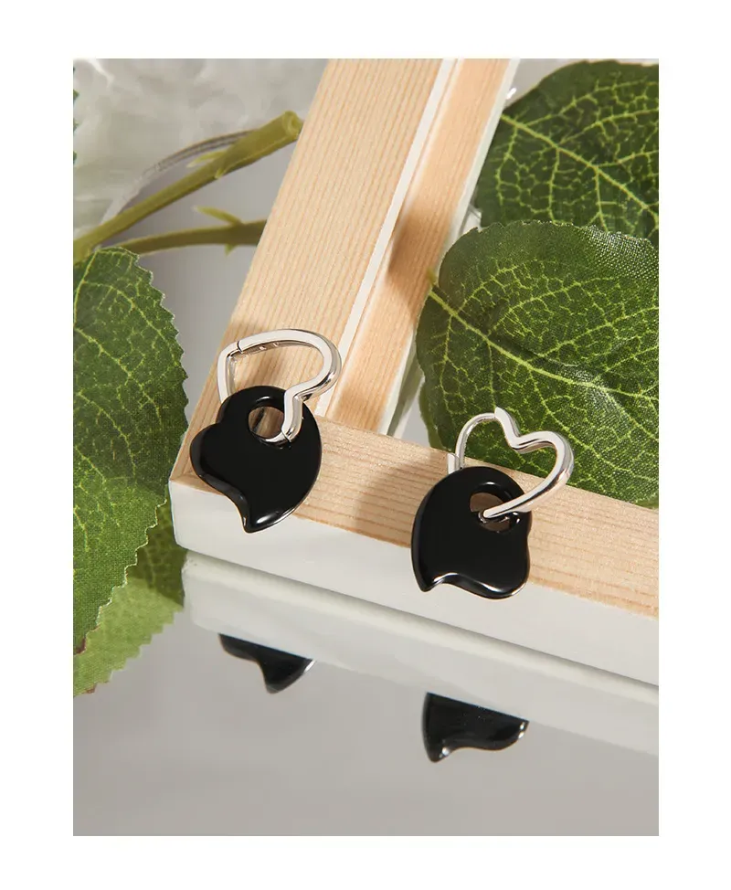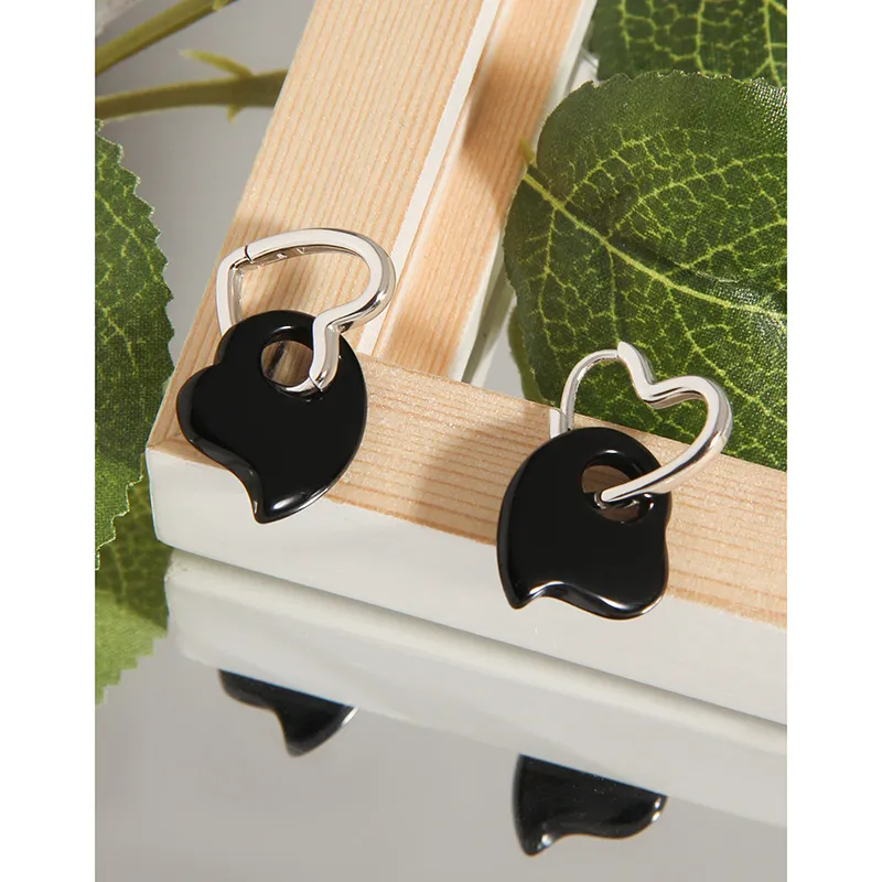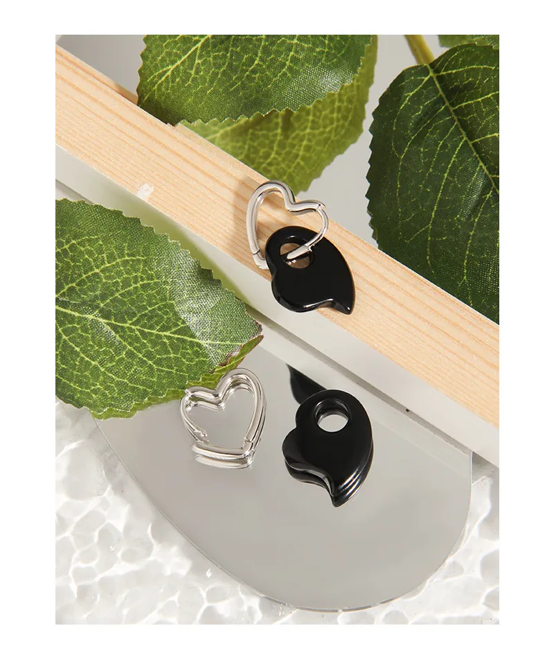 - Patterns & Textures: The black heart charm has a highly polished, smooth texture with a brilliant glossy finish that reflects light. Its shape is organically fluid and slightly asymmetrical, evoking a natural, softened silhouette. This is complemented by the sleek, polished metallic surface of the silver-tone heart-shaped hoop.