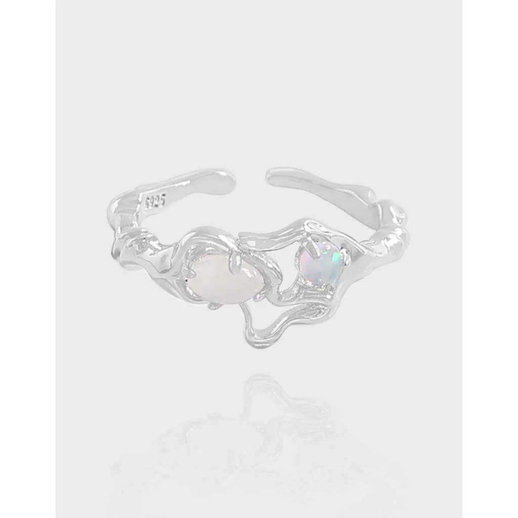 Crafted in luminous silver-toned metal, the Zelunara Ring features two captivating opalescent stones. One exhibits a milky, serene white glow, while the other dazzles with ethereal flashes of pastel blues, purples, and greens, mirroring the iridescent shimmer of the night sky.