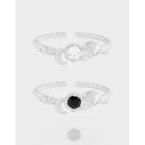 - Patterns & Textures: The band is adorned with a delicate beaded texture, reminiscent of tiny moon dust or ocean spray. It beautifully showcases a charming crescent moon, a sparkling star, and a finely detailed scallop shell. A central, eye-catching round gemstone is nestled within the design, complemented by smaller, smooth spherical beads that add a subtle, organic touch.
