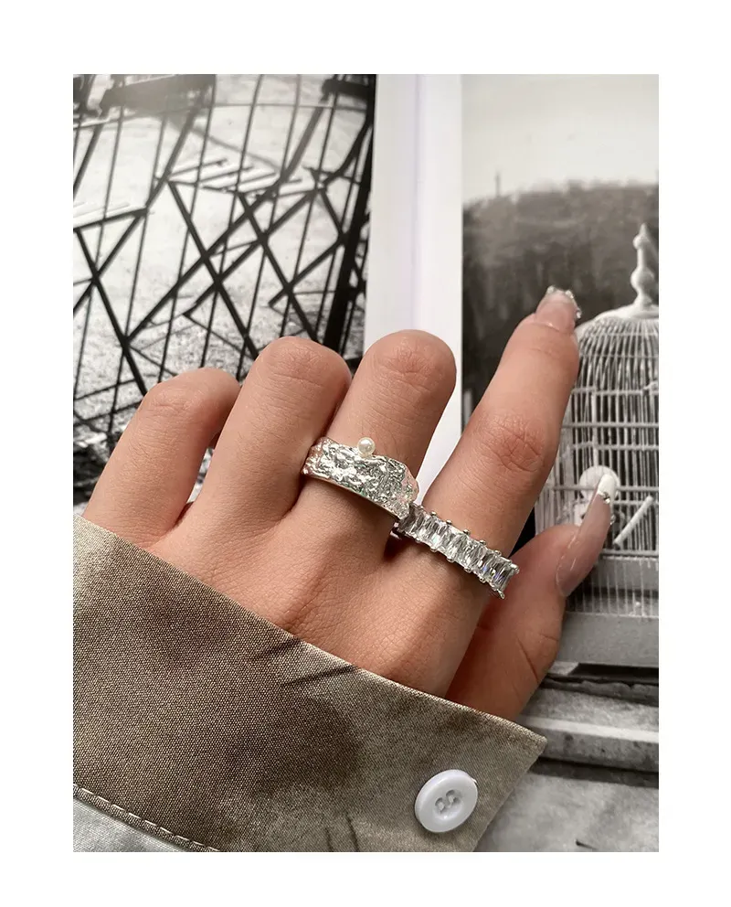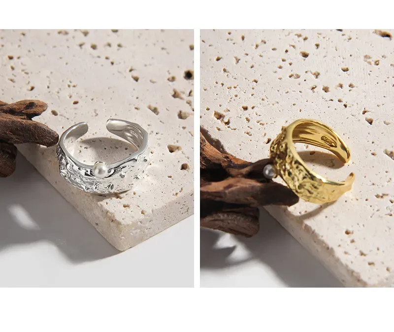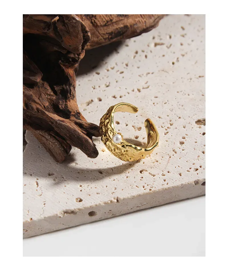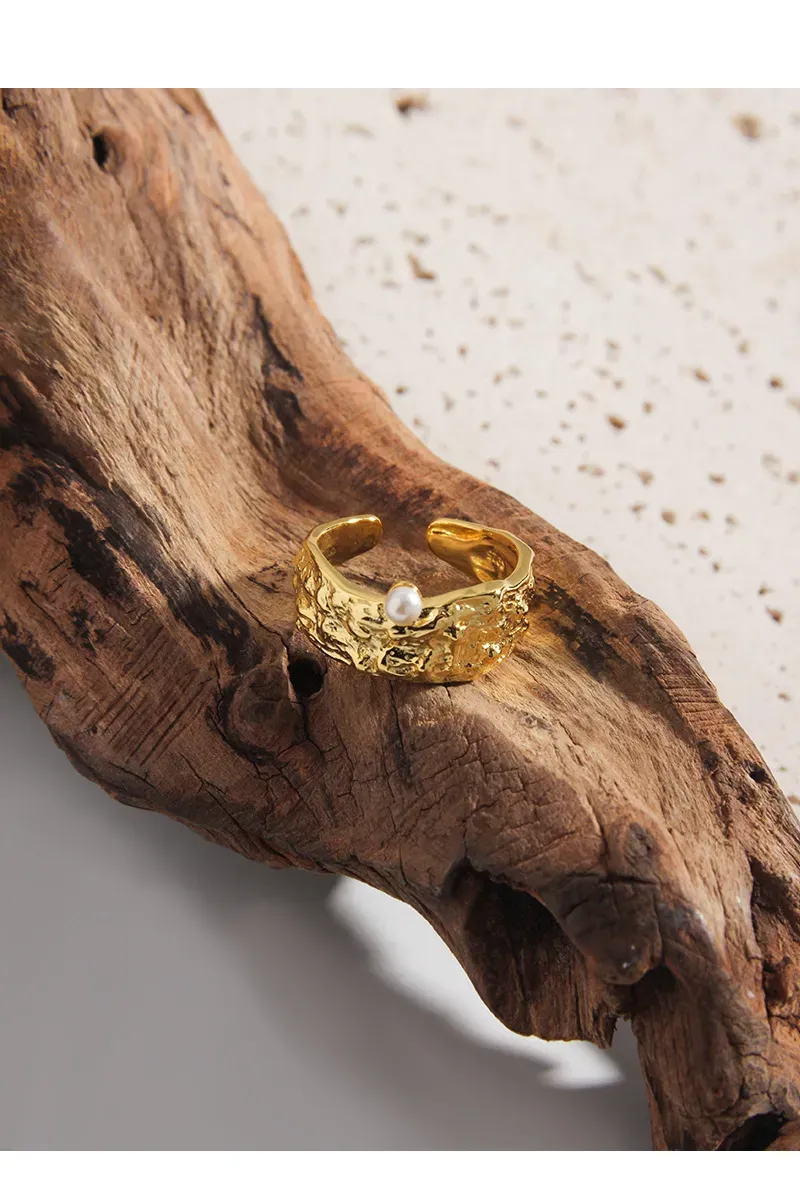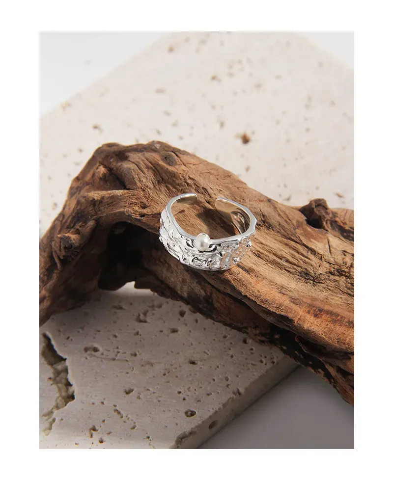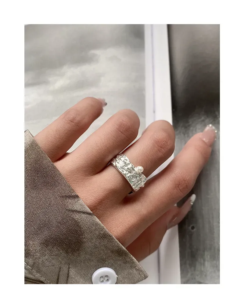 • Texture: A distinctively raw, hammered, and organic surface, beautifully contrasting with the smooth, lustrous pearl delicately set into the band.