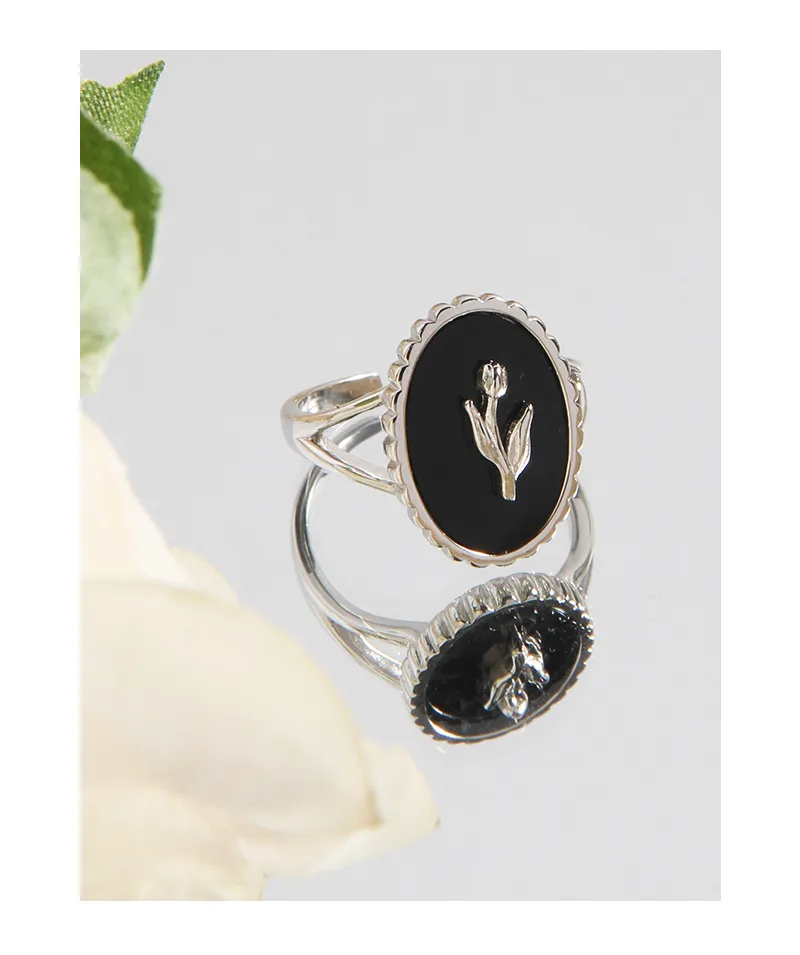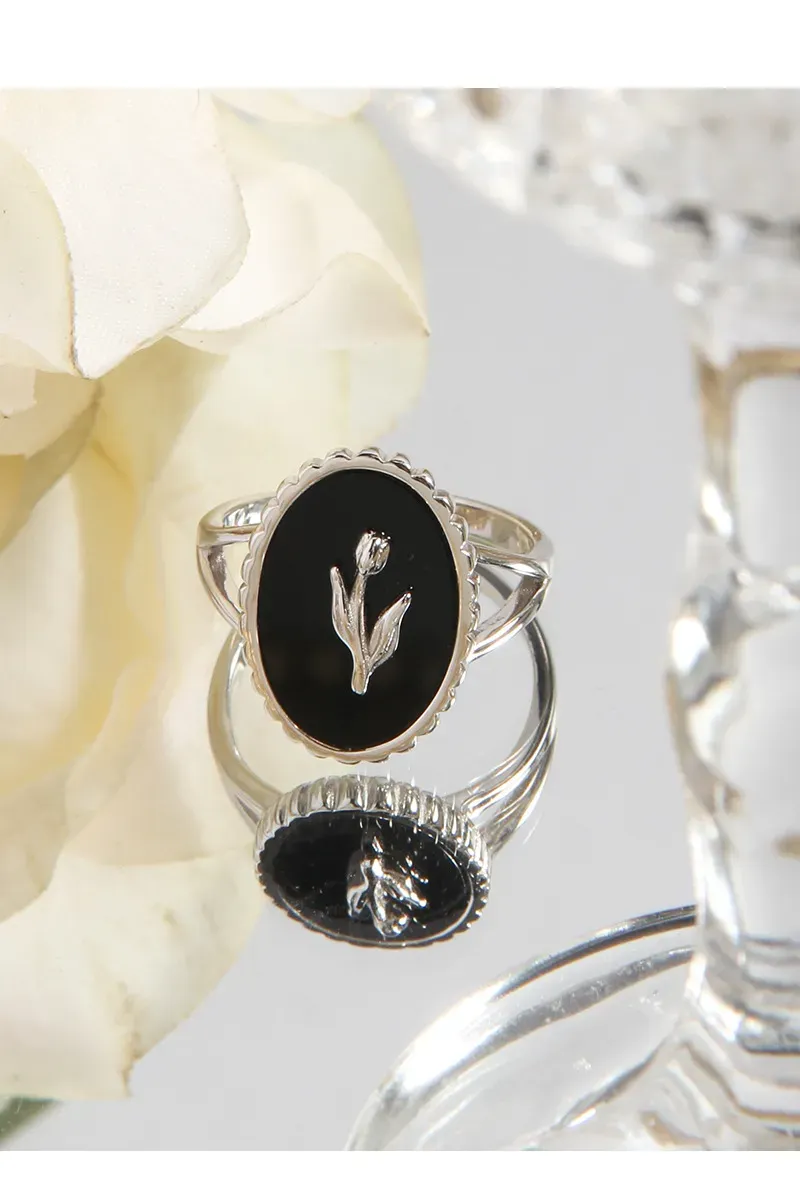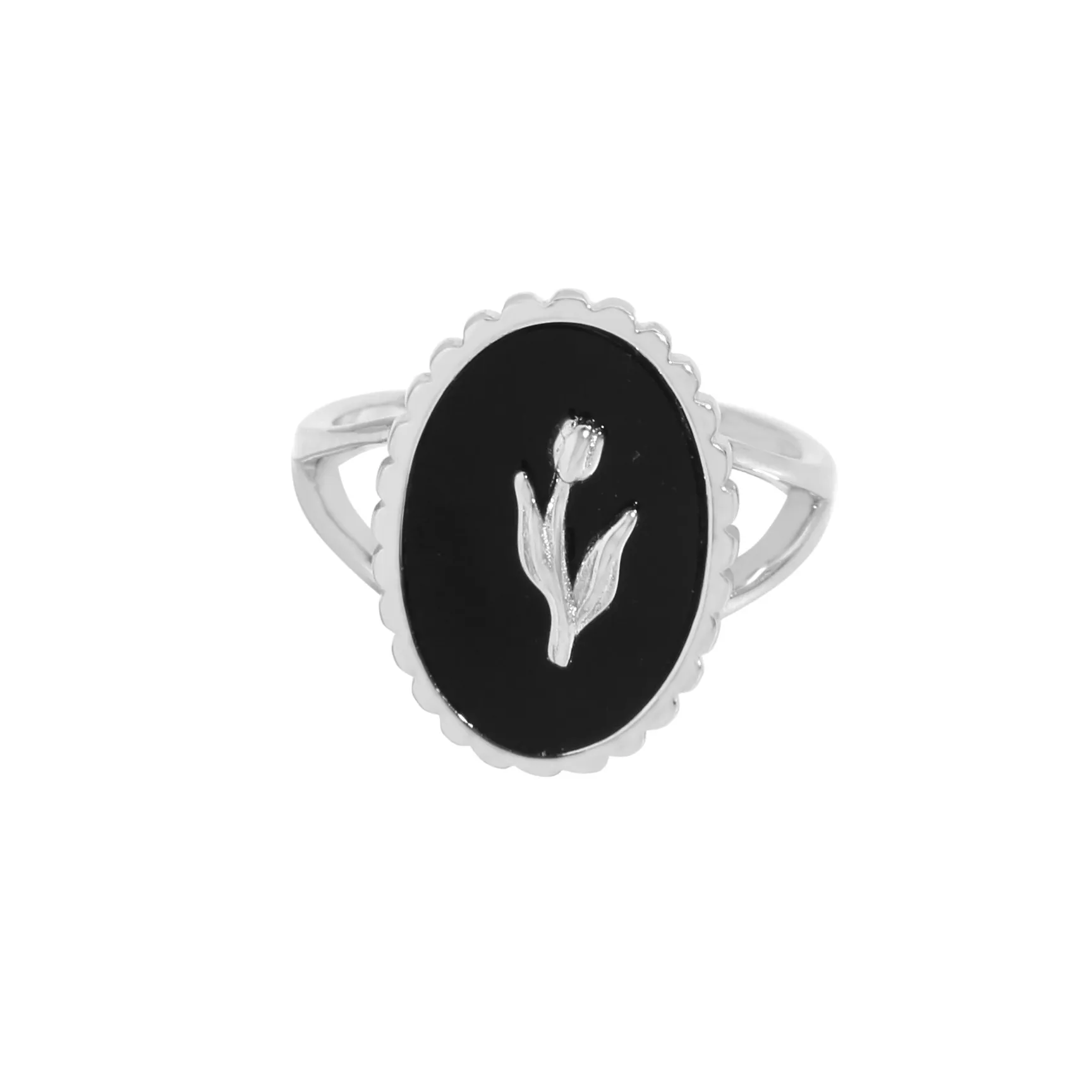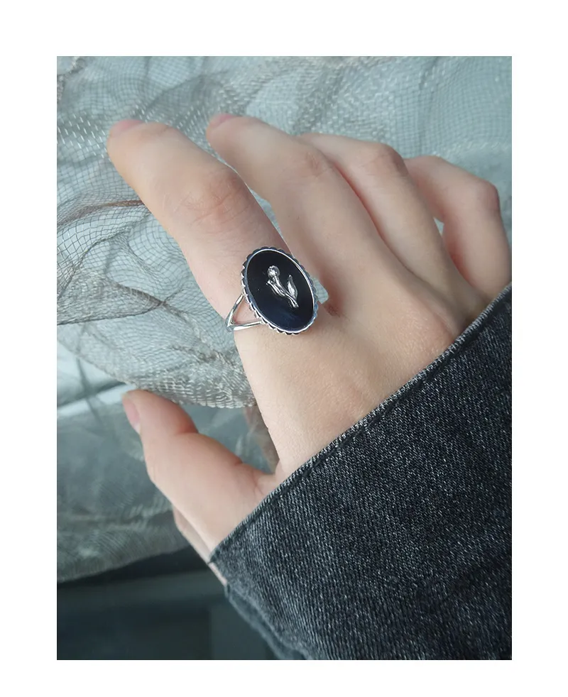 This captivating ring showcases a vibrant contrast between the polished silver of its band and the deep, lustrous black enamel filling the central oval. The delicate tulip motif is highlighted in an ethereal white-silver tone, creating a luminous focal point.