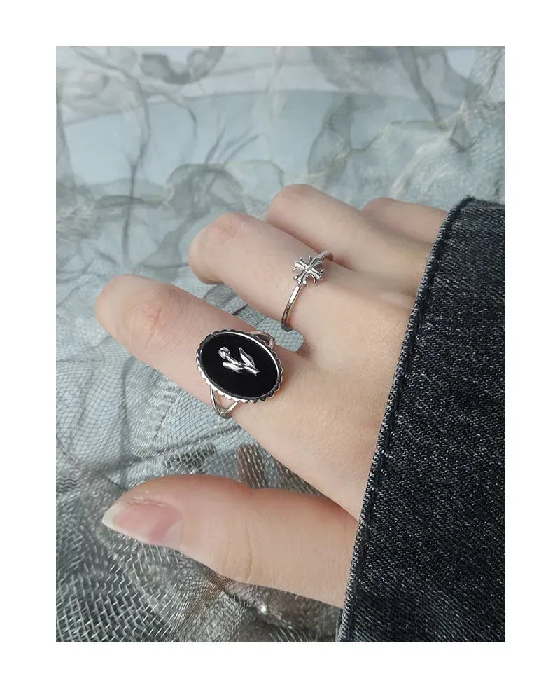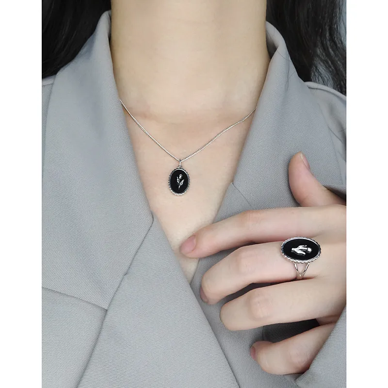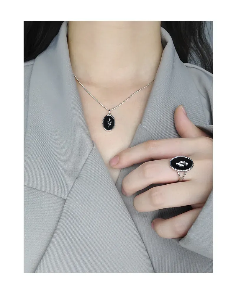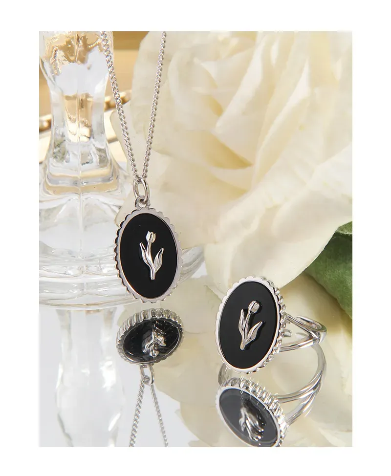 This captivating ring showcases a vibrant contrast between the polished silver of its band and the deep, lustrous black enamel filling the central oval. The delicate tulip motif is highlighted in an ethereal white-silver tone, creating a luminous focal point.