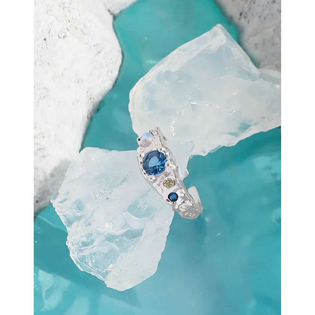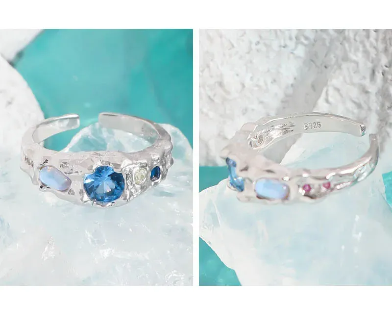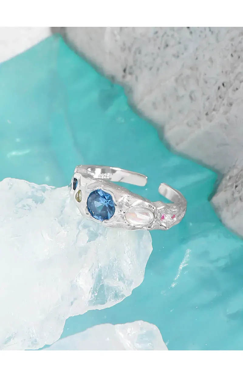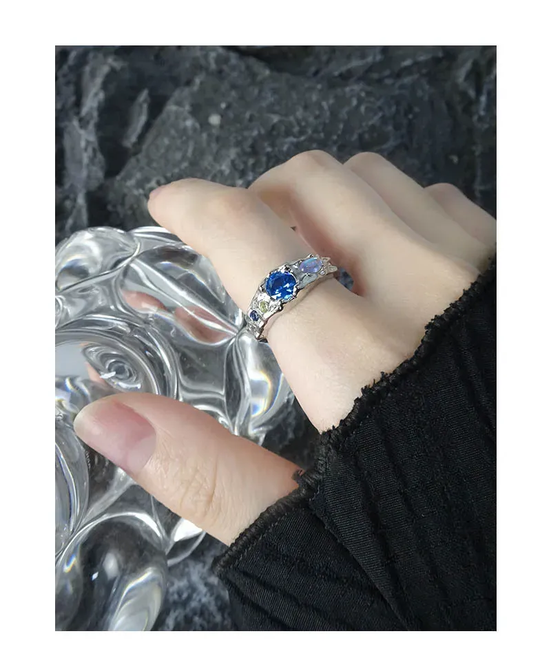 • Color: Crafted from lustrous silver-toned metal, the Zueri Ring features an enchanting array of natural-toned gemstones. A prominent, faceted blue stone takes center stage, flanked by smaller accents of deep indigo, soft yellow, and an iridescent opal-like gem that shimmers with hints of pink, blue, and orange, reminiscent of a celestial light show.