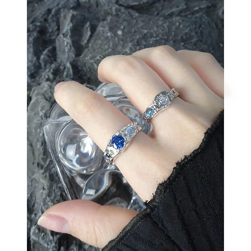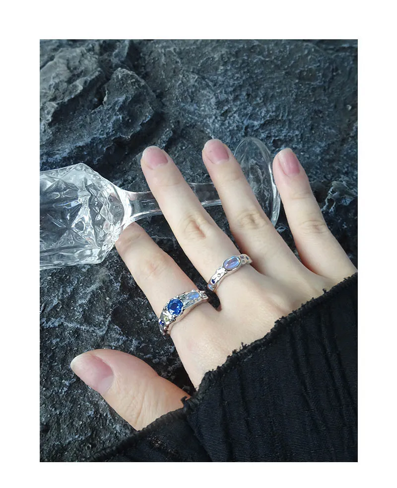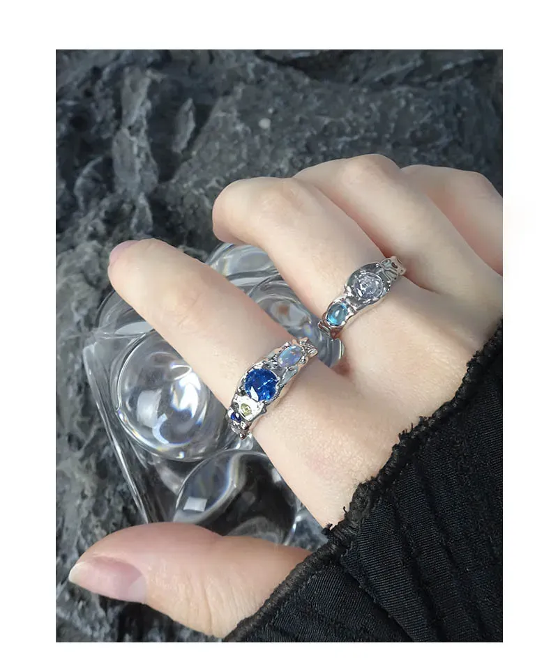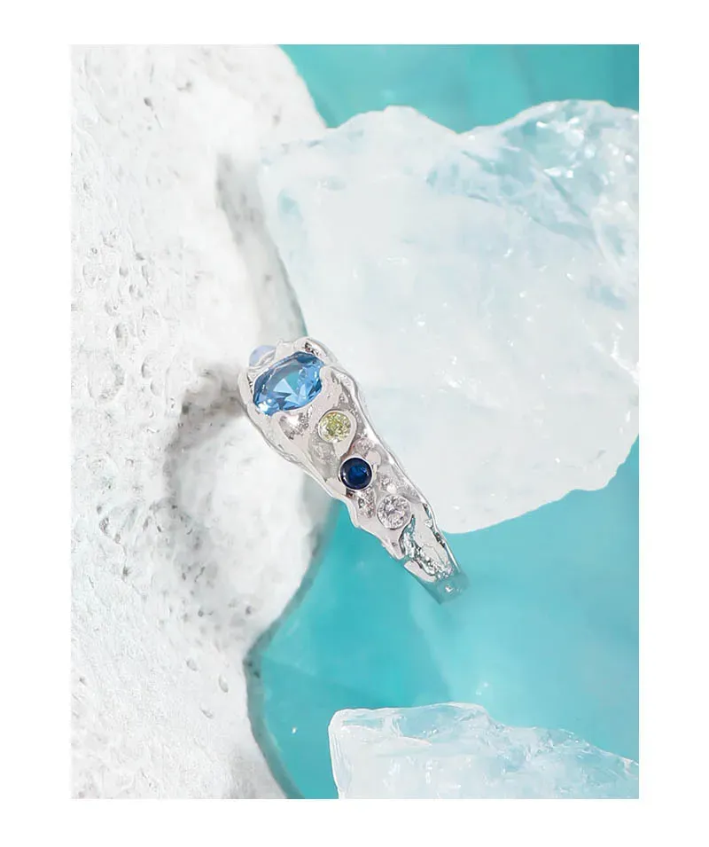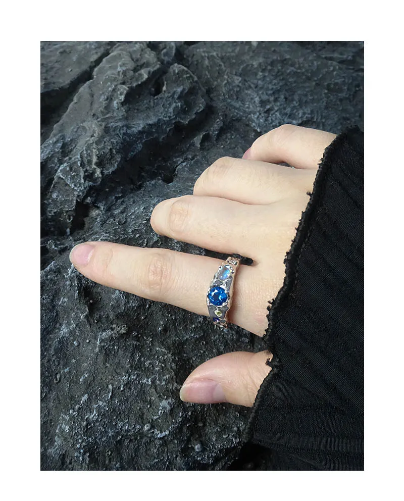 • Color: Crafted from lustrous silver-toned metal, the Zueri Ring features an enchanting array of natural-toned gemstones. A prominent, faceted blue stone takes center stage, flanked by smaller accents of deep indigo, soft yellow, and an iridescent opal-like gem that shimmers with hints of pink, blue, and orange, reminiscent of a celestial light show.