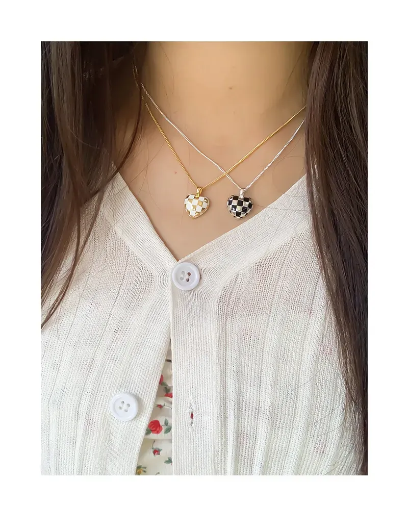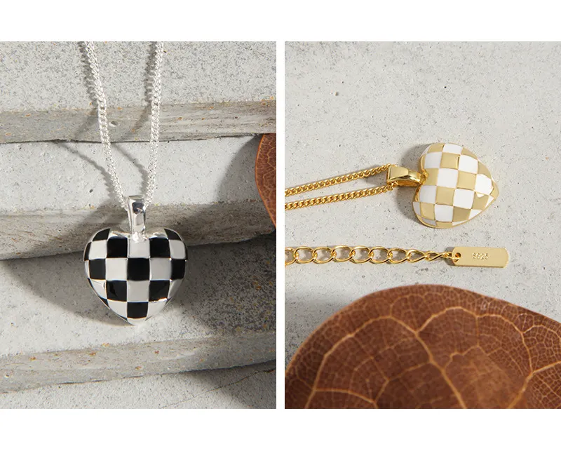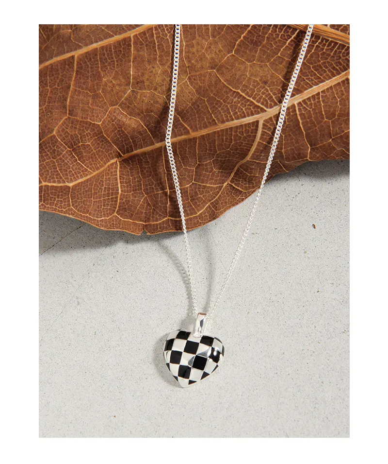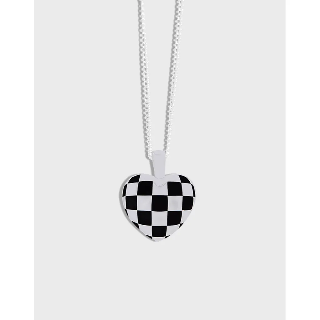 Color: The centerpiece is a striking heart pendant adorned in a classic black and white checkerboard pattern, creating a vibrant contrast. The pendant is gracefully suspended from a lustrous silver-toned chain, adding a bright and versatile finish.
