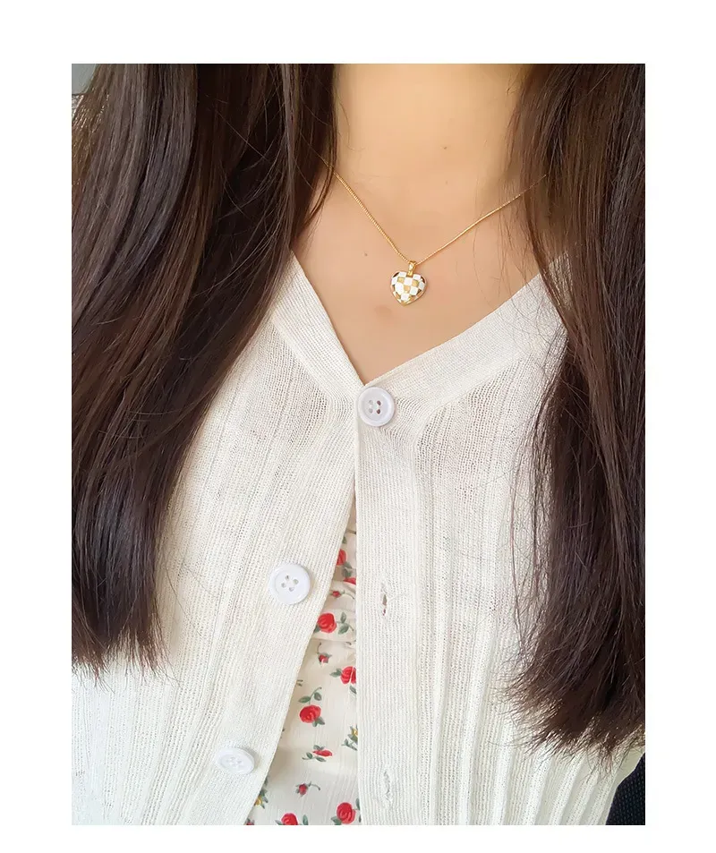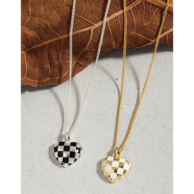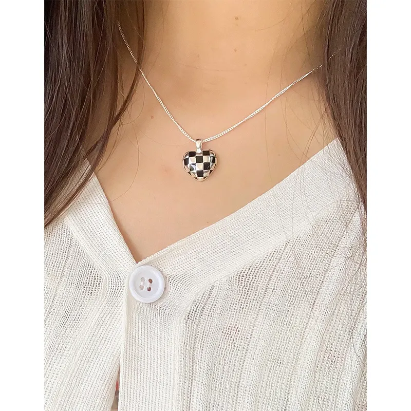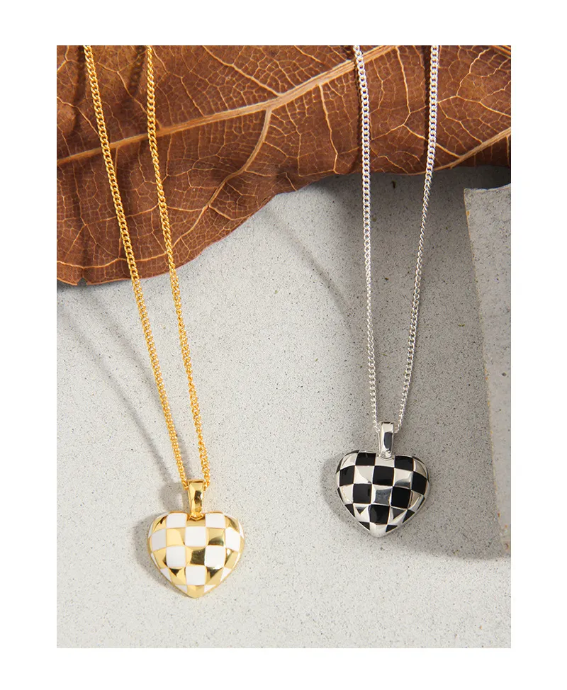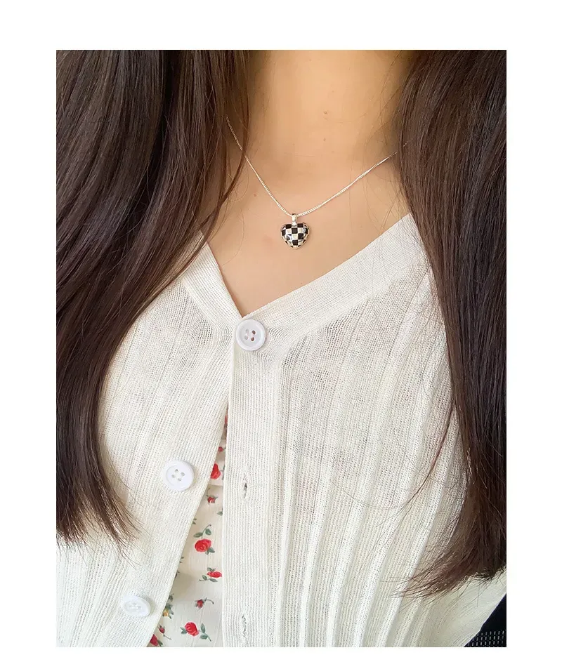 Color: The centerpiece is a striking heart pendant adorned in a classic black and white checkerboard pattern, creating a vibrant contrast. The pendant is gracefully suspended from a lustrous silver-toned chain, adding a bright and versatile finish.