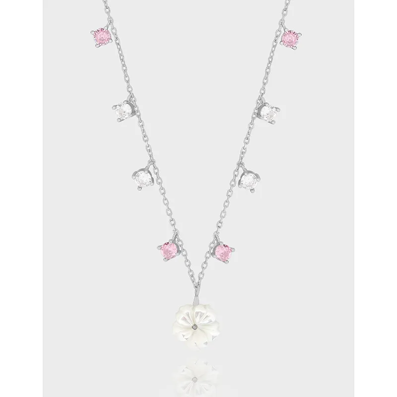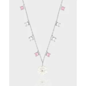• Color: A lustrous silver-tone chain provides a radiant base, adorned with alternating blush pink and clear brilliant-cut stones. The focal point is a serene, off-white floral pendant, evoking the purity of a freshly bloomed flower.