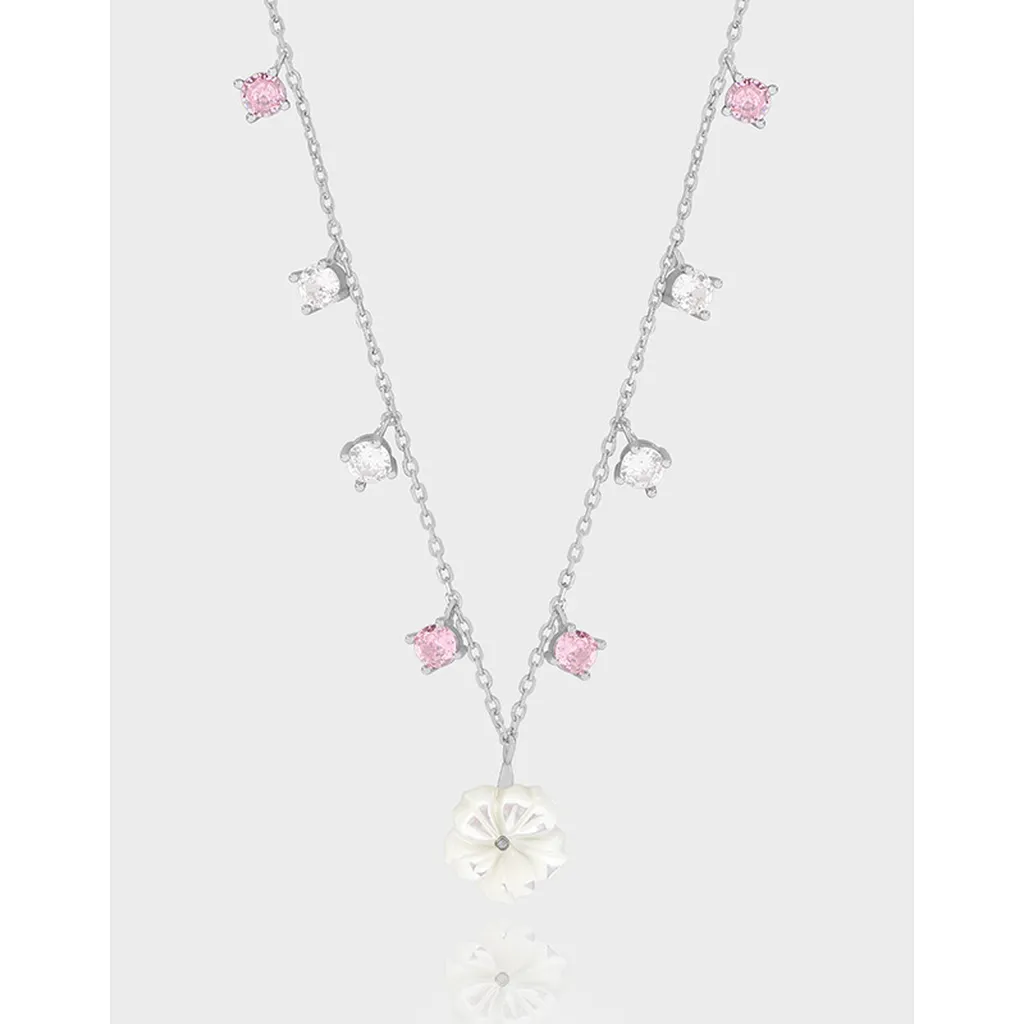 - Color: A lustrous silver-tone chain provides a radiant base, adorned with alternating blush pink and clear brilliant-cut stones. The focal point is a serene, off-white floral pendant, evoking the purity of a freshly bloomed flower.
