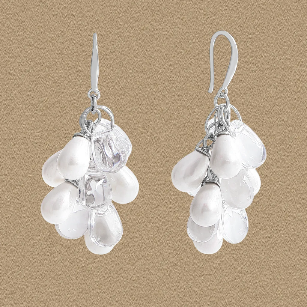 - Color: These elegant Zurivia Earrings feature luminous white pearls gracefully intertwined with translucent, clear beads. The delicate cluster is suspended from polished, silver-toned hooks and rings, creating a harmonious blend of pristine white and crystalline clarity.